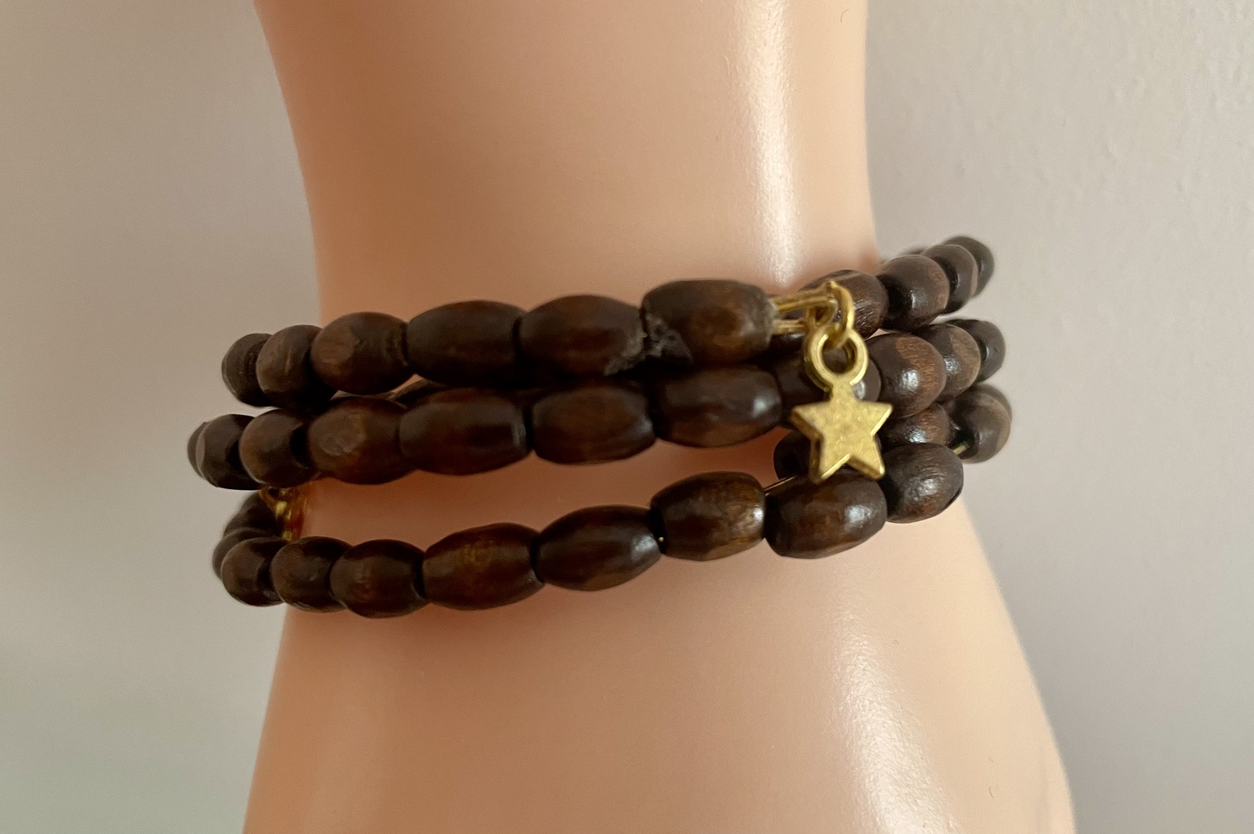 Ein edles Armband mit Holzperlen, lässt sich einfach am Arm anlegen, ohne zusätzlichen Verschluss. An den beiden Enden ist jeweils ein kleiner goldfarbener Stern als Abschluss.