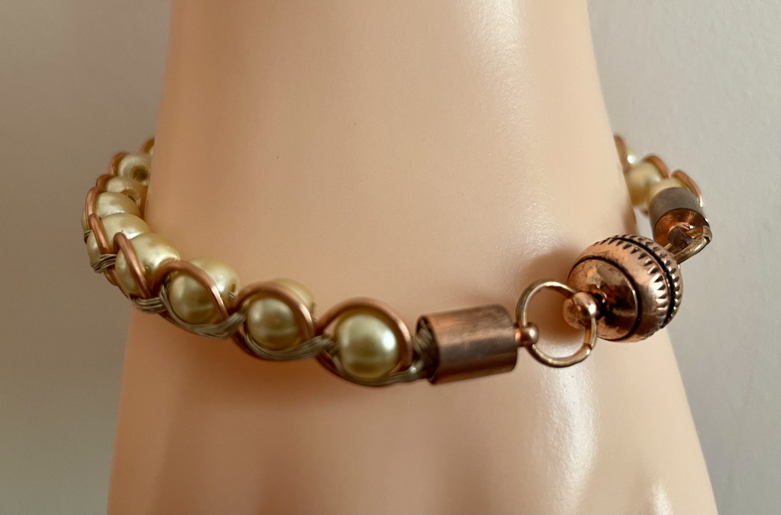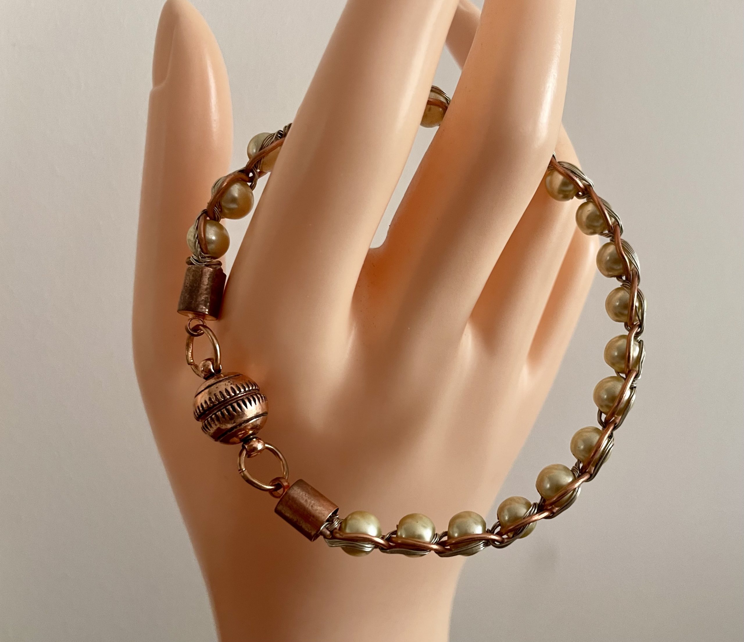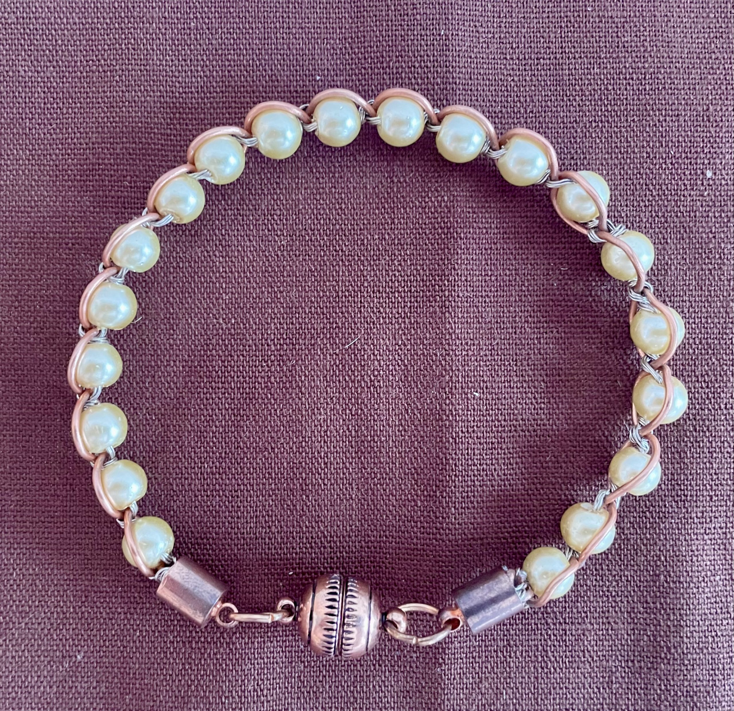 Ein Armband für jede Party oder Feier. Aus hellen Perlen mit Schmuck-Kupferdraht hergestellt. Geschlossen wird das Armband mit einem passenden starken Magnetverschluss.