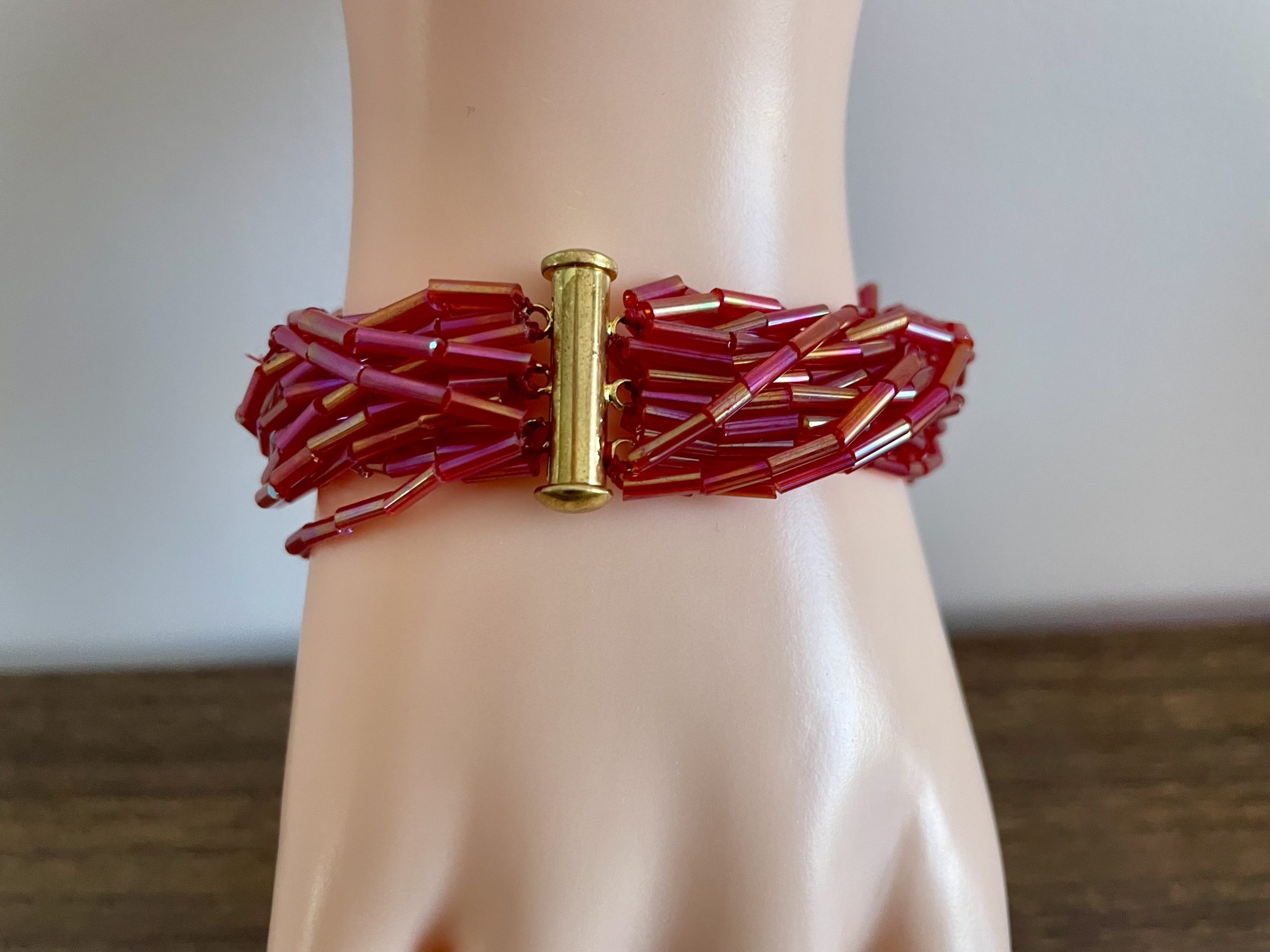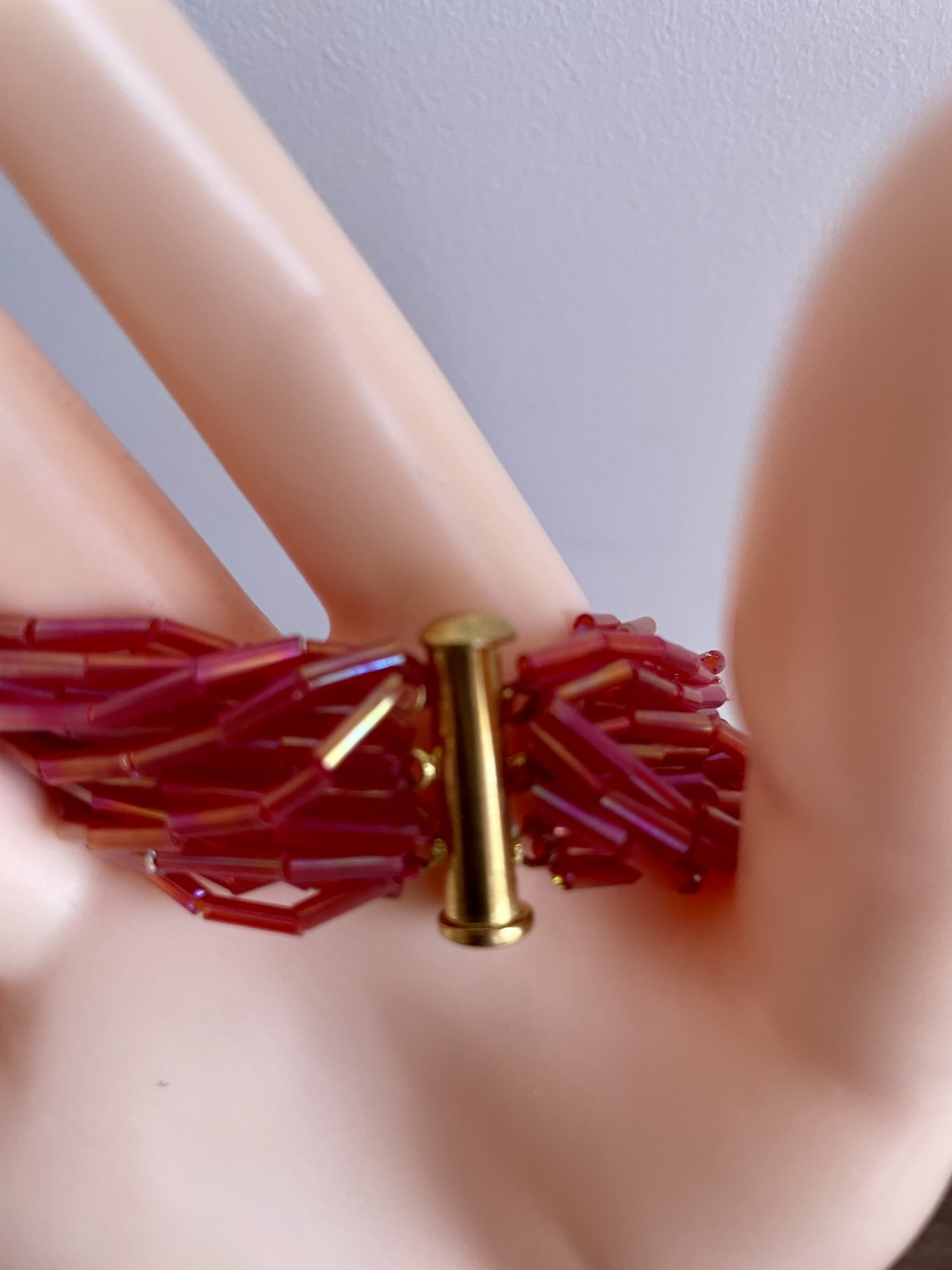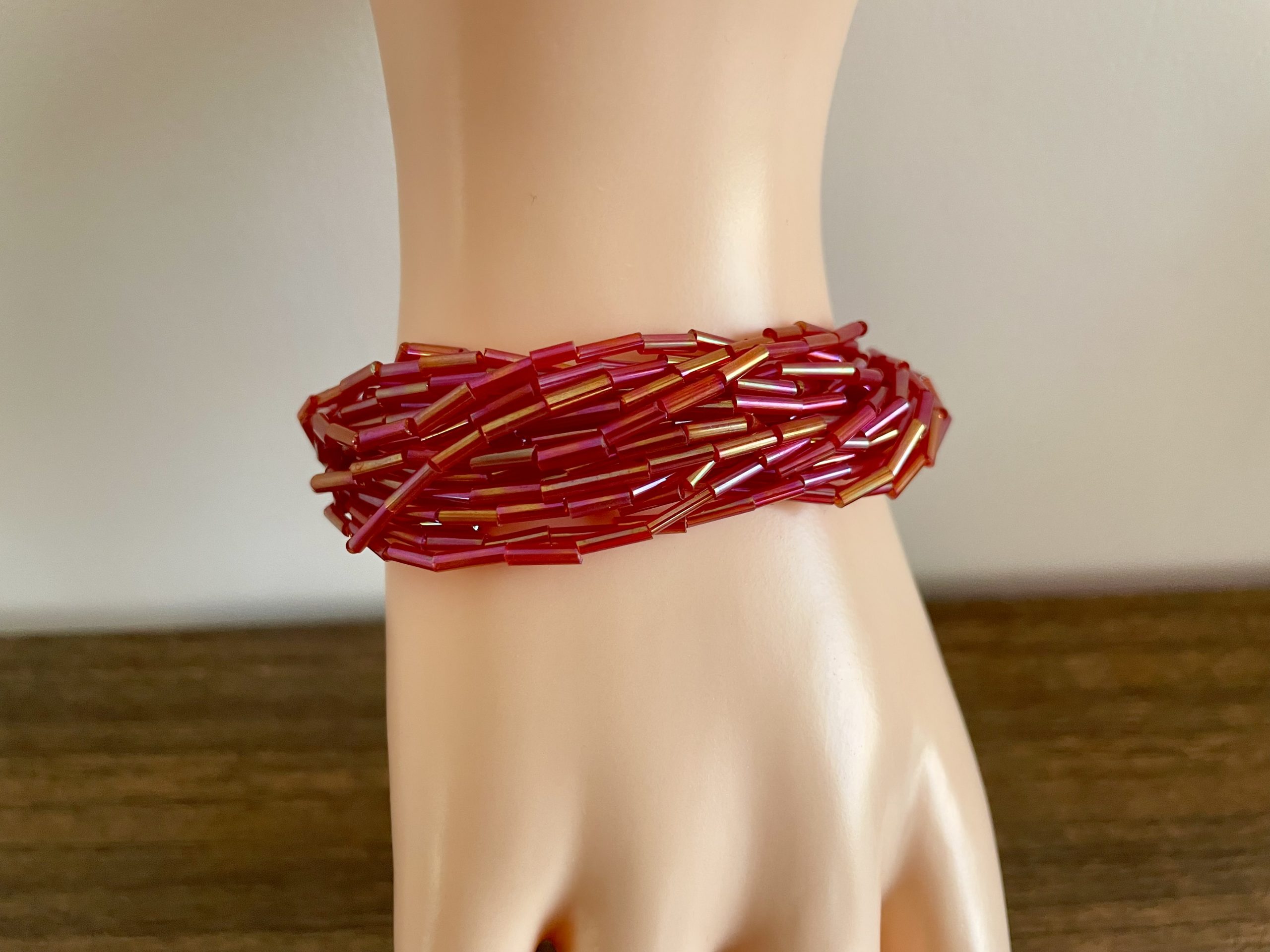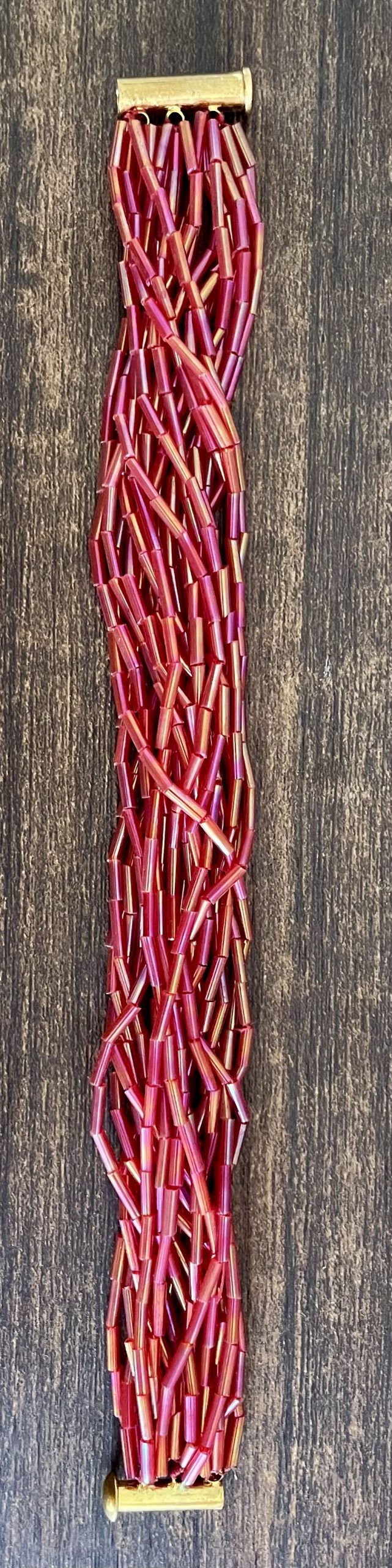 Armband aus roten Glasperlen mit je nach Beleuchtung mit Goldschimmer.