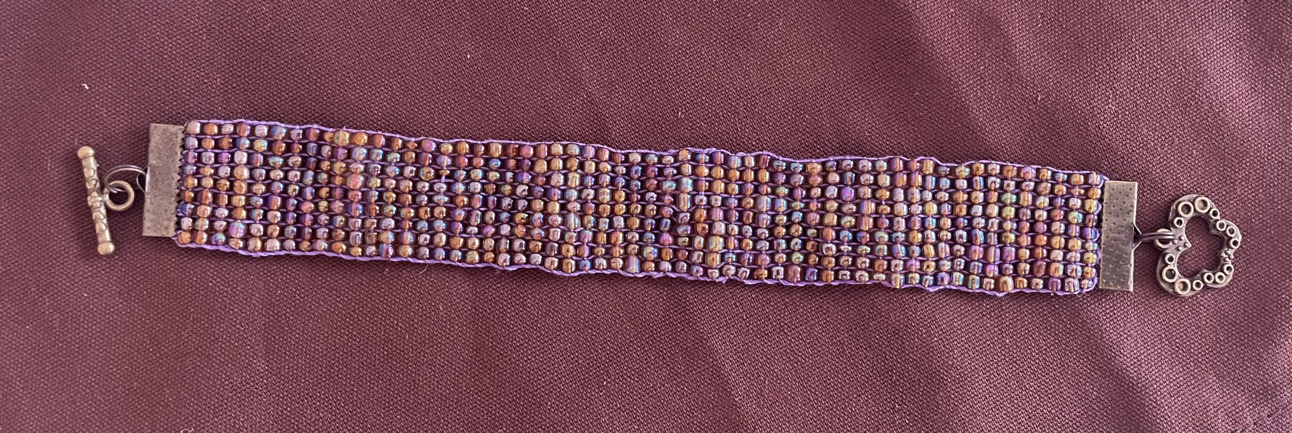 Ein filigranes edles Armband aus vielen schimmernden Glasperlen, wird geschlossen durch Knüppelverschluss, durch einen „Schmetterling“