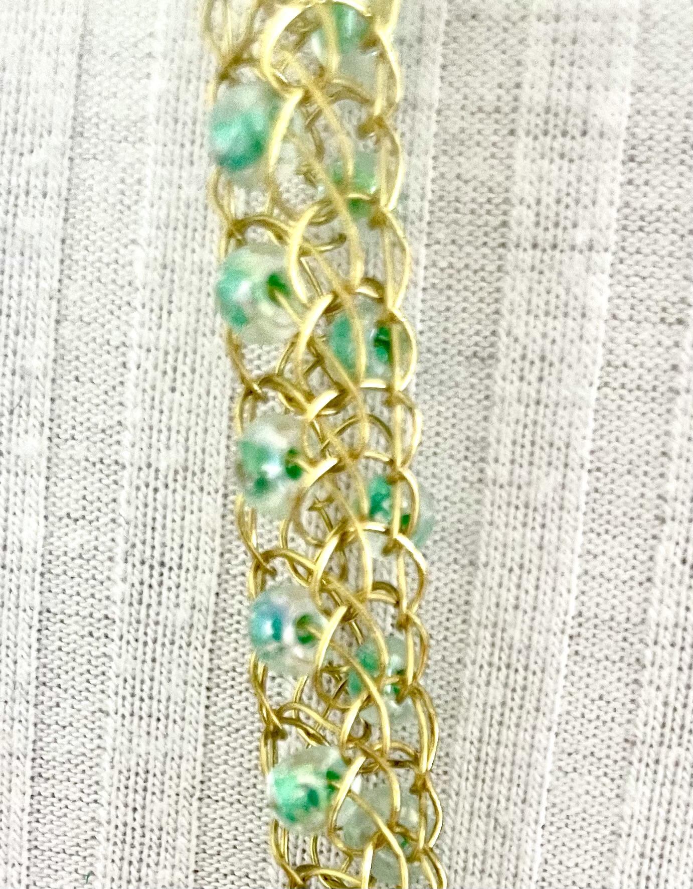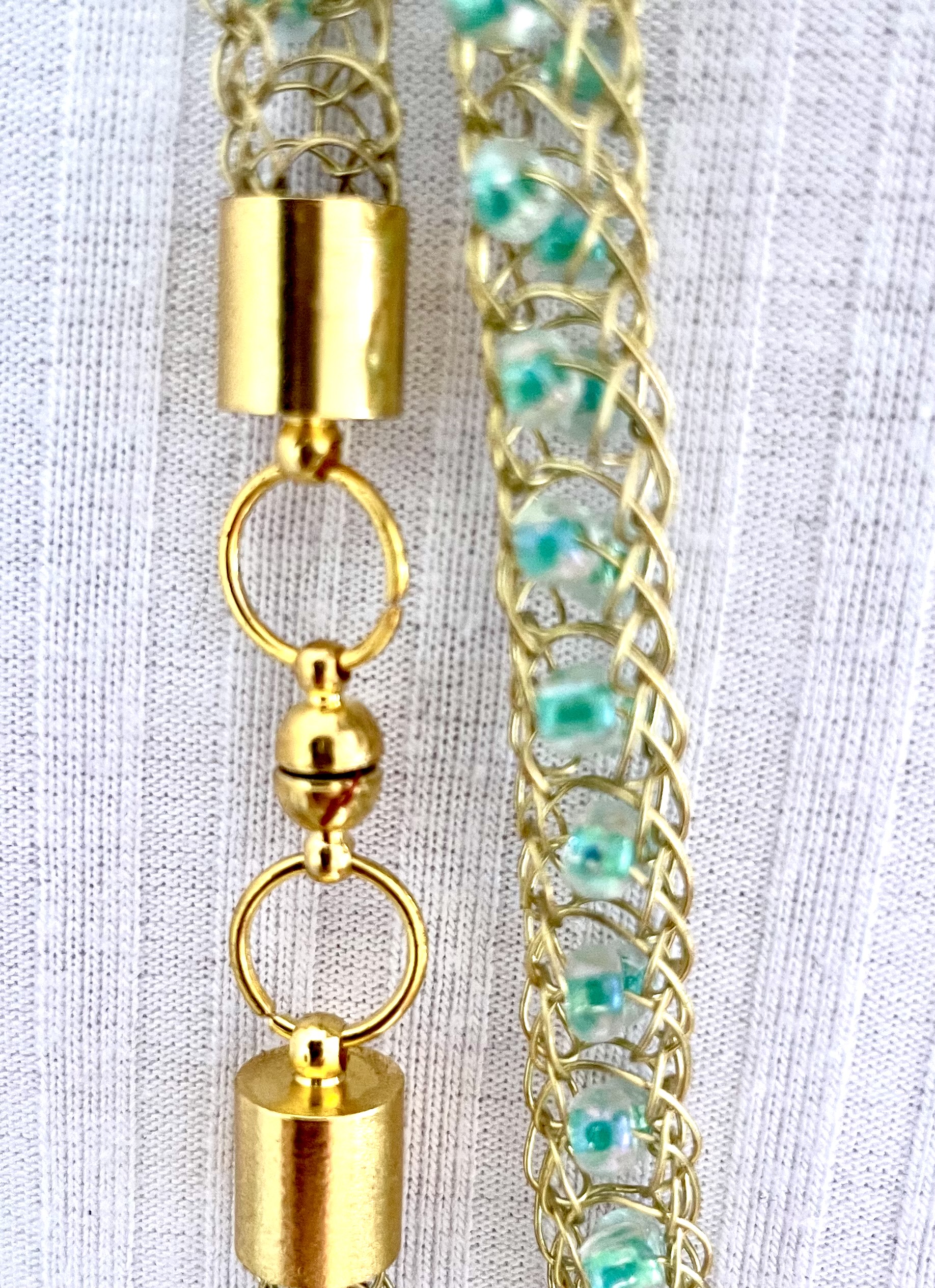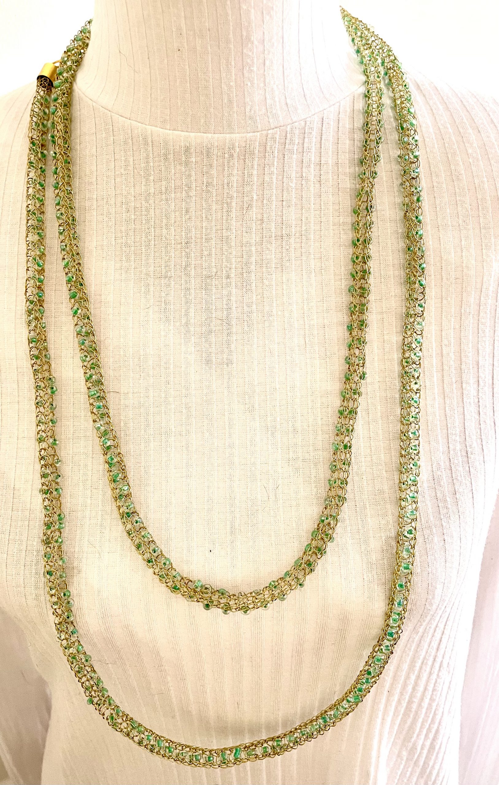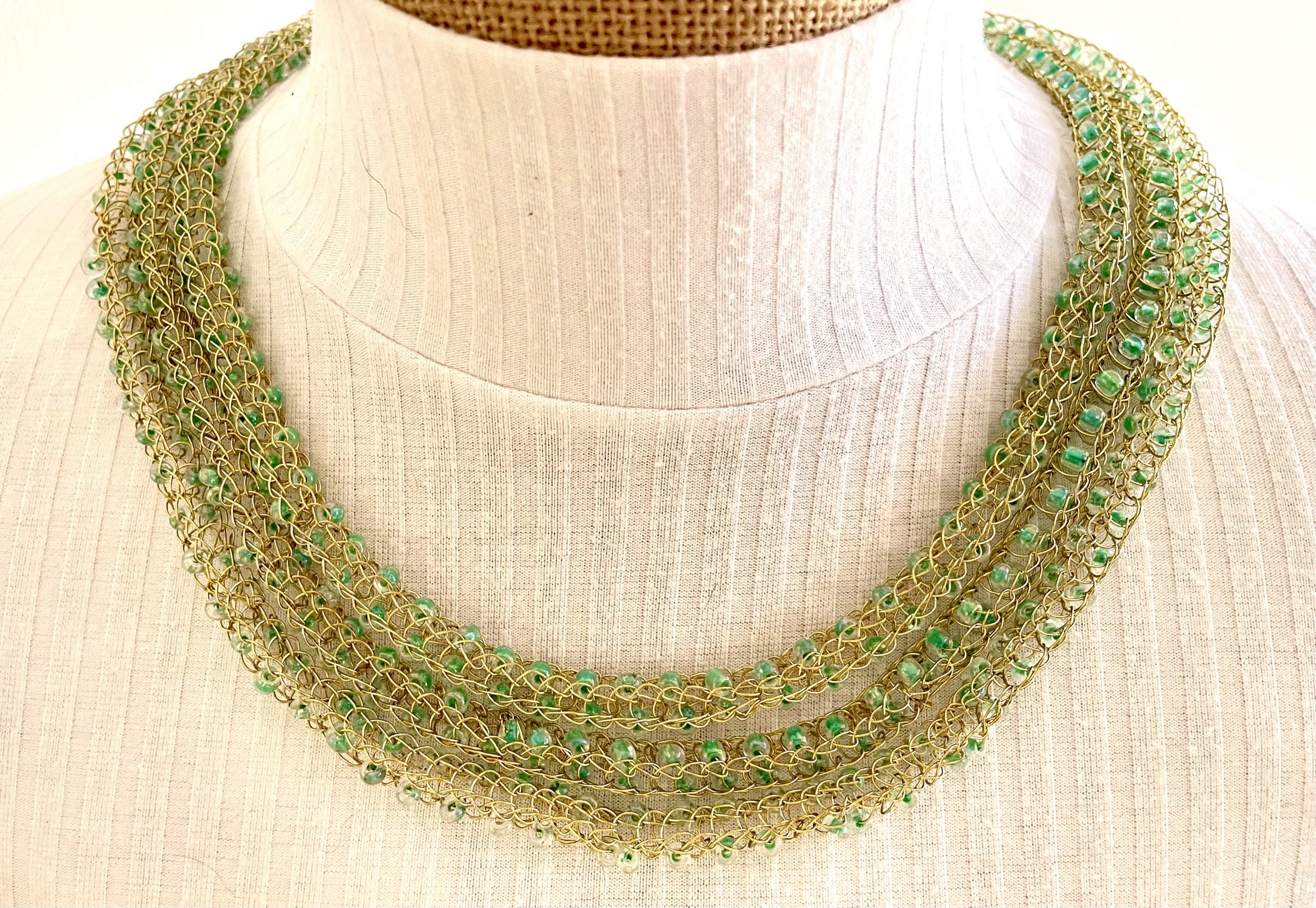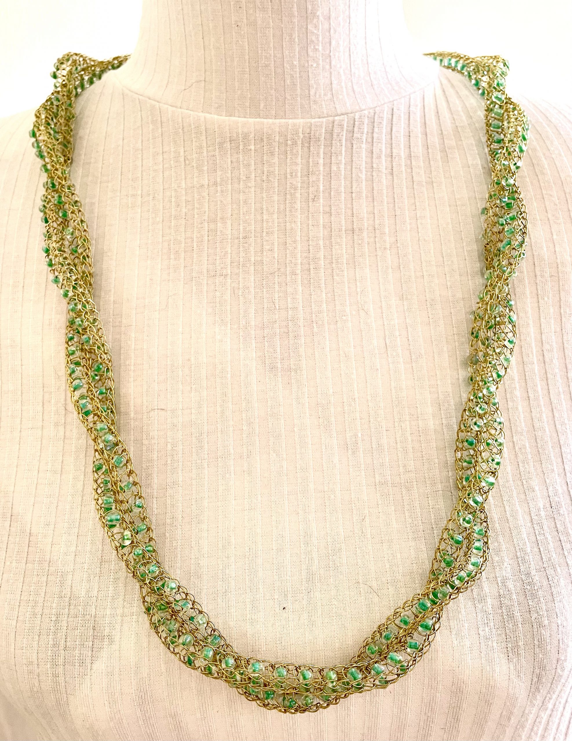Ein weiterer Hingucker, handgestrickte edle und filigrane Halskette aus messingfarbenem Schmuck-Kupferdraht mit eingearbeiteten kleinen grünen Glasperlen.