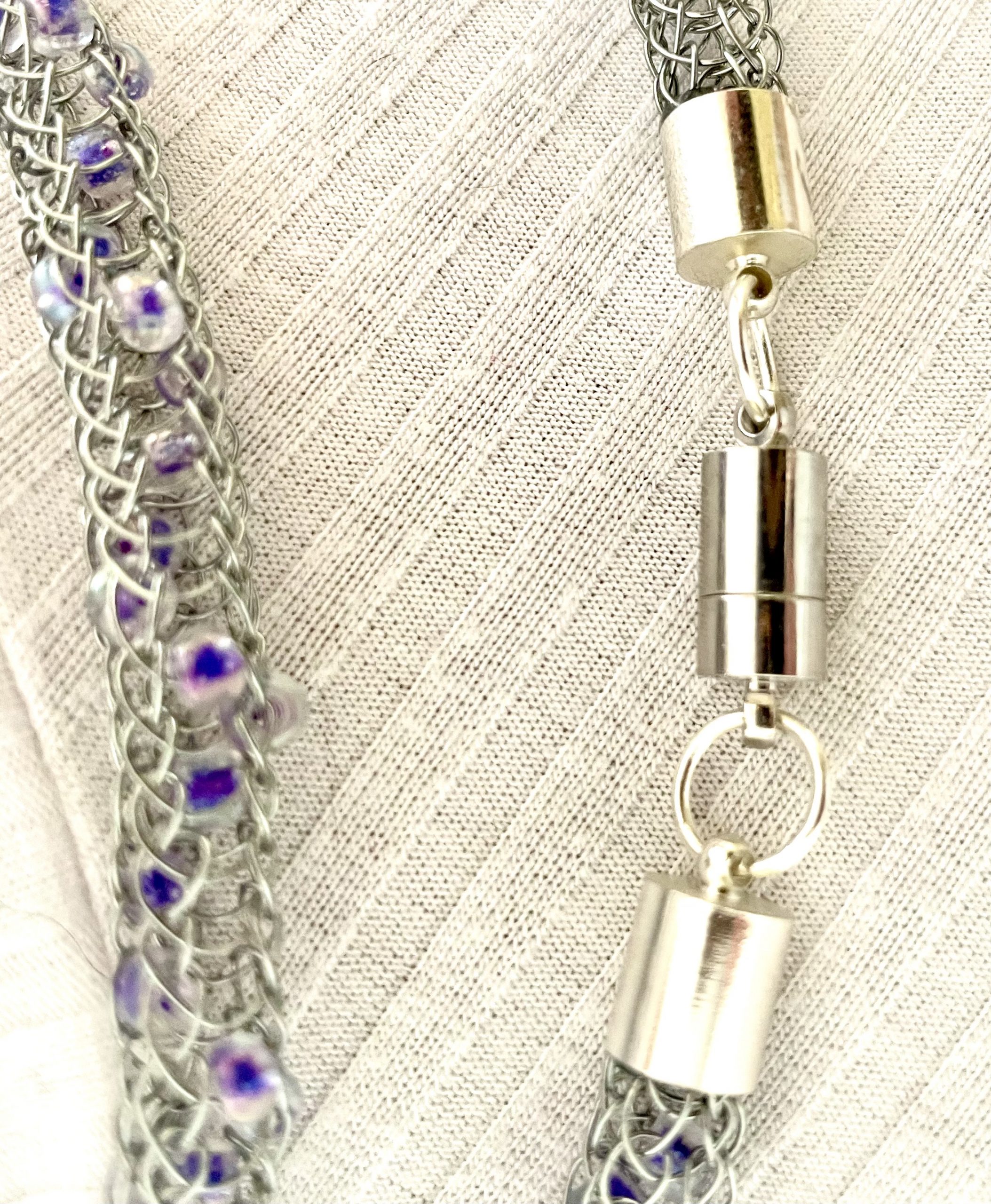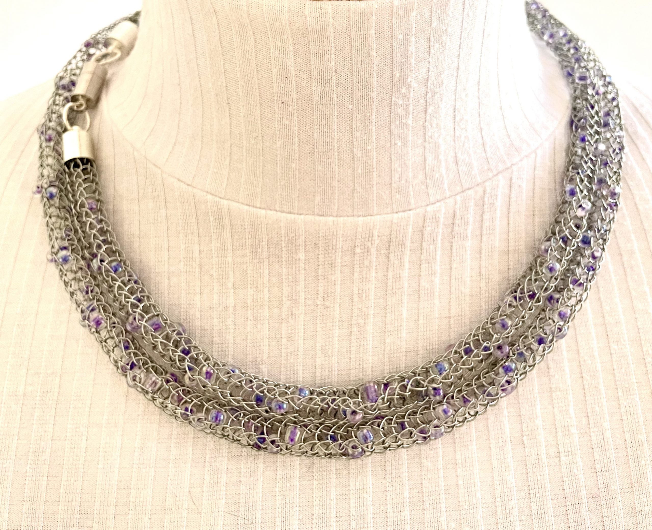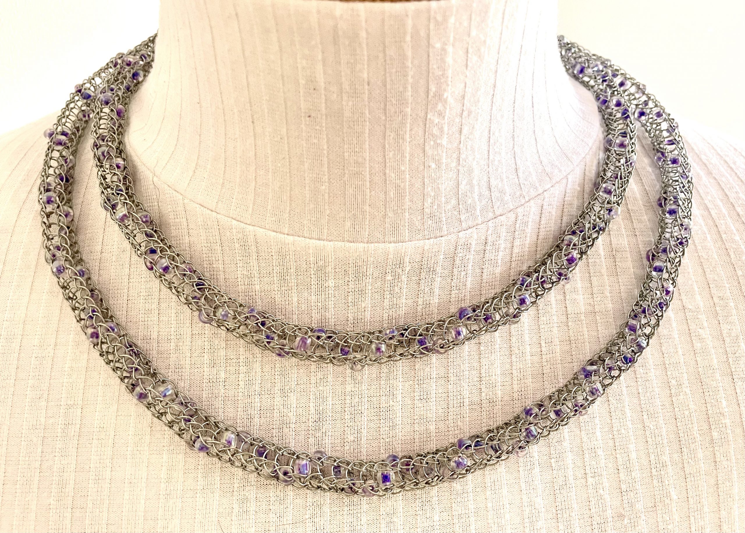 Mein nächster Hingucker, weitere edle und filigrane Halskette handgestrickt aus silberfarbenem Schmuck-Kupferdraht mit eingearbeiteten kleinen hellen lila Glasperlen.