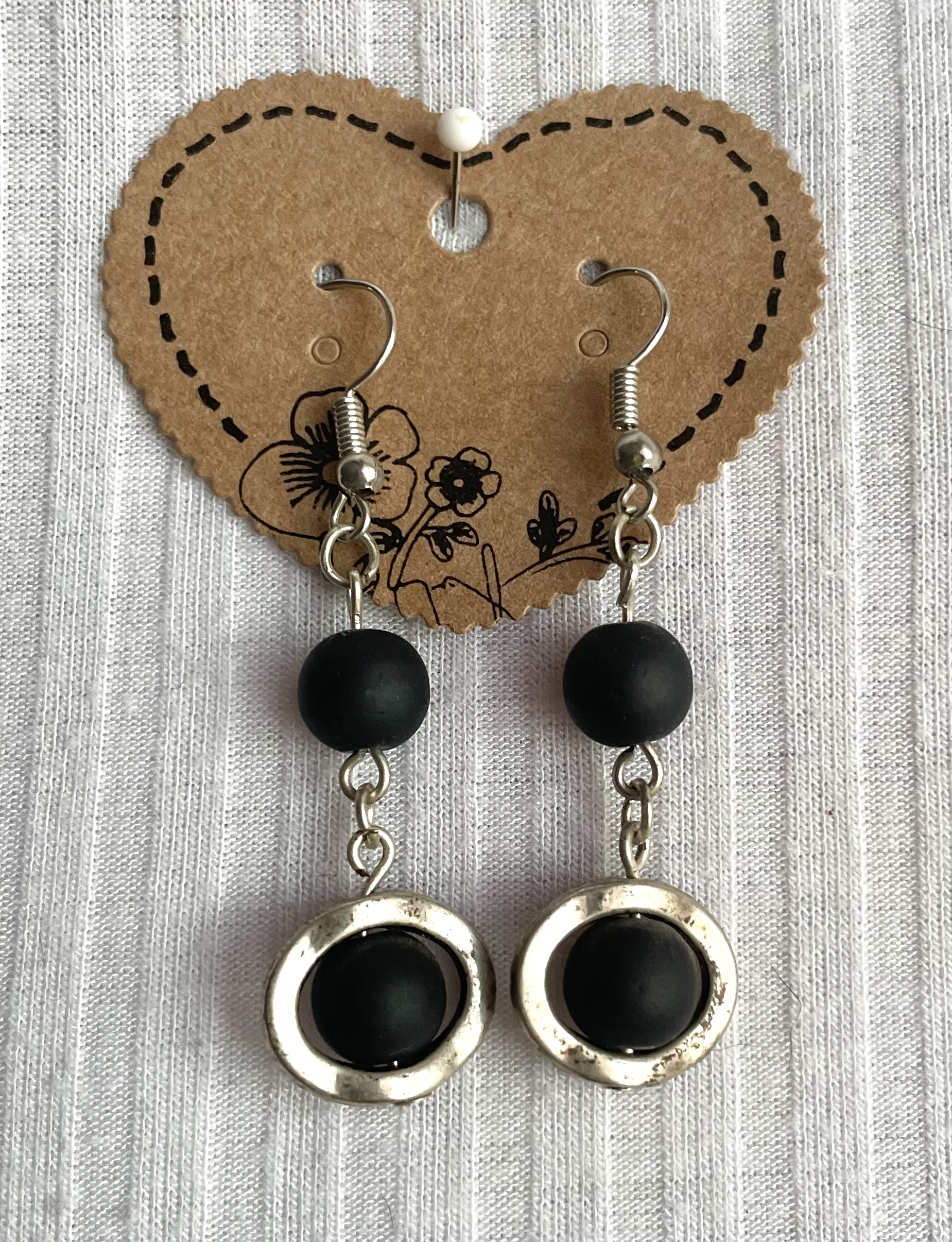 Diese edlen silberfarbenen Ohrringe sind ca 35 mm lang, jeweils mit 2 schwarzen Glasperlen hergestellt.