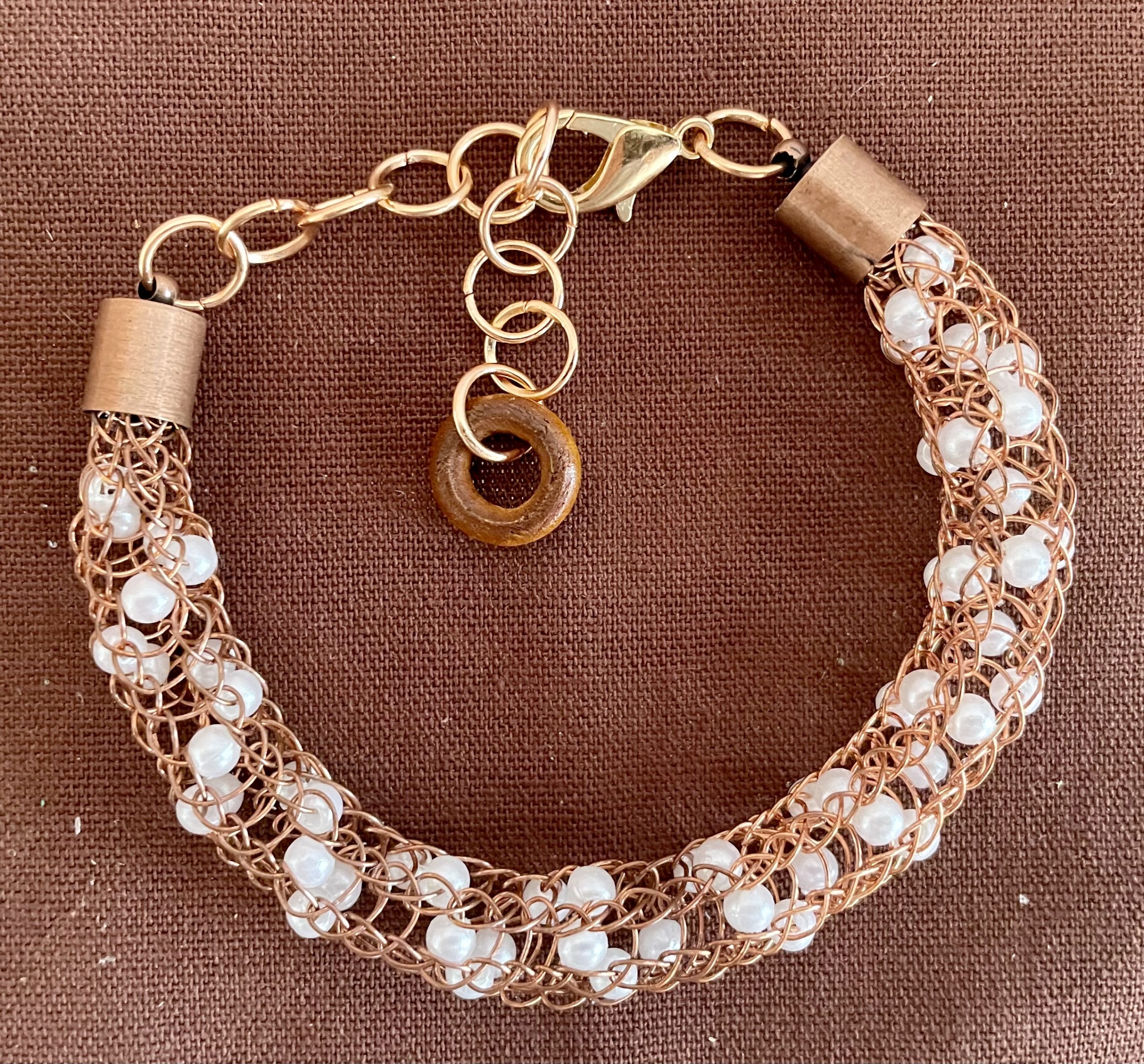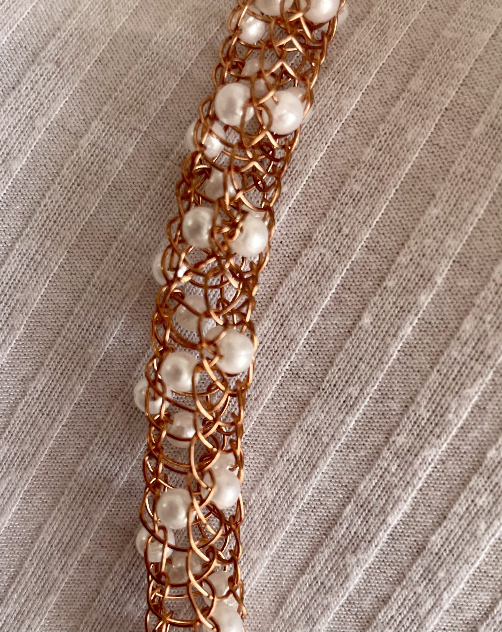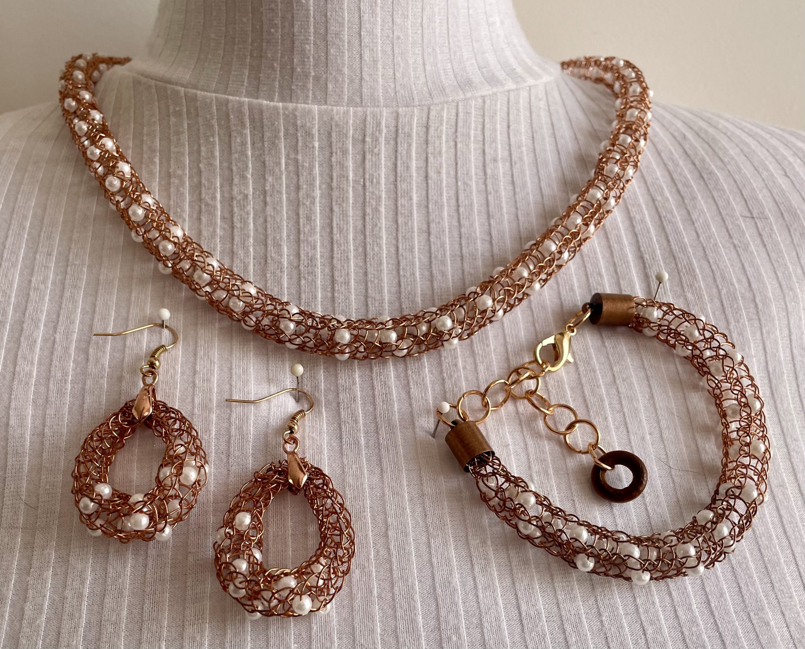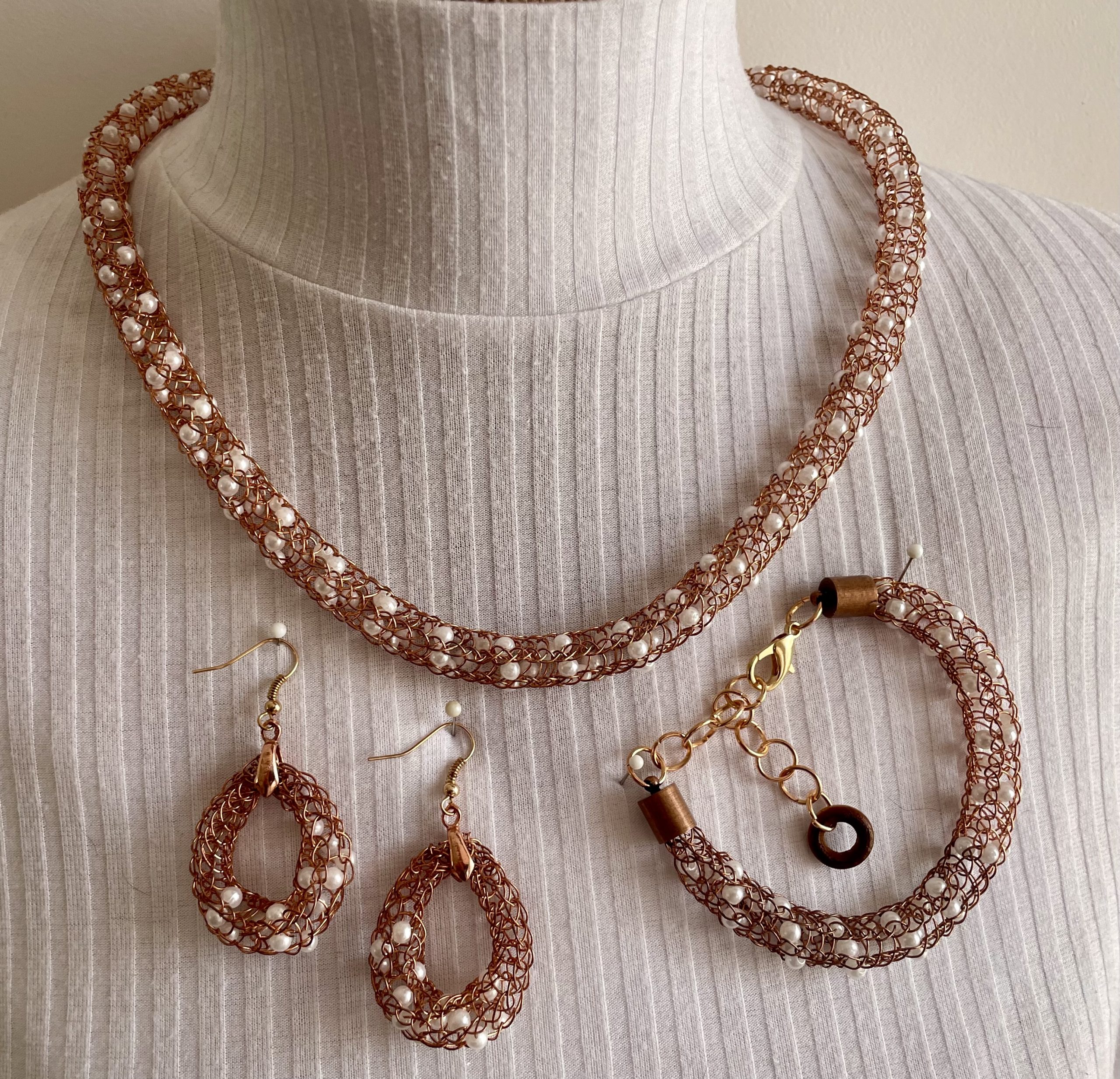 4-teiliges edles Schmuckset handgestrickt aus kupferfarbenen Schmuck-Kupferdraht, mit eingearbeiteten weißen Perlen