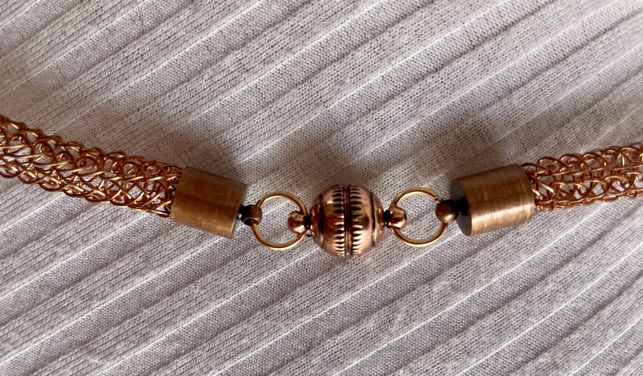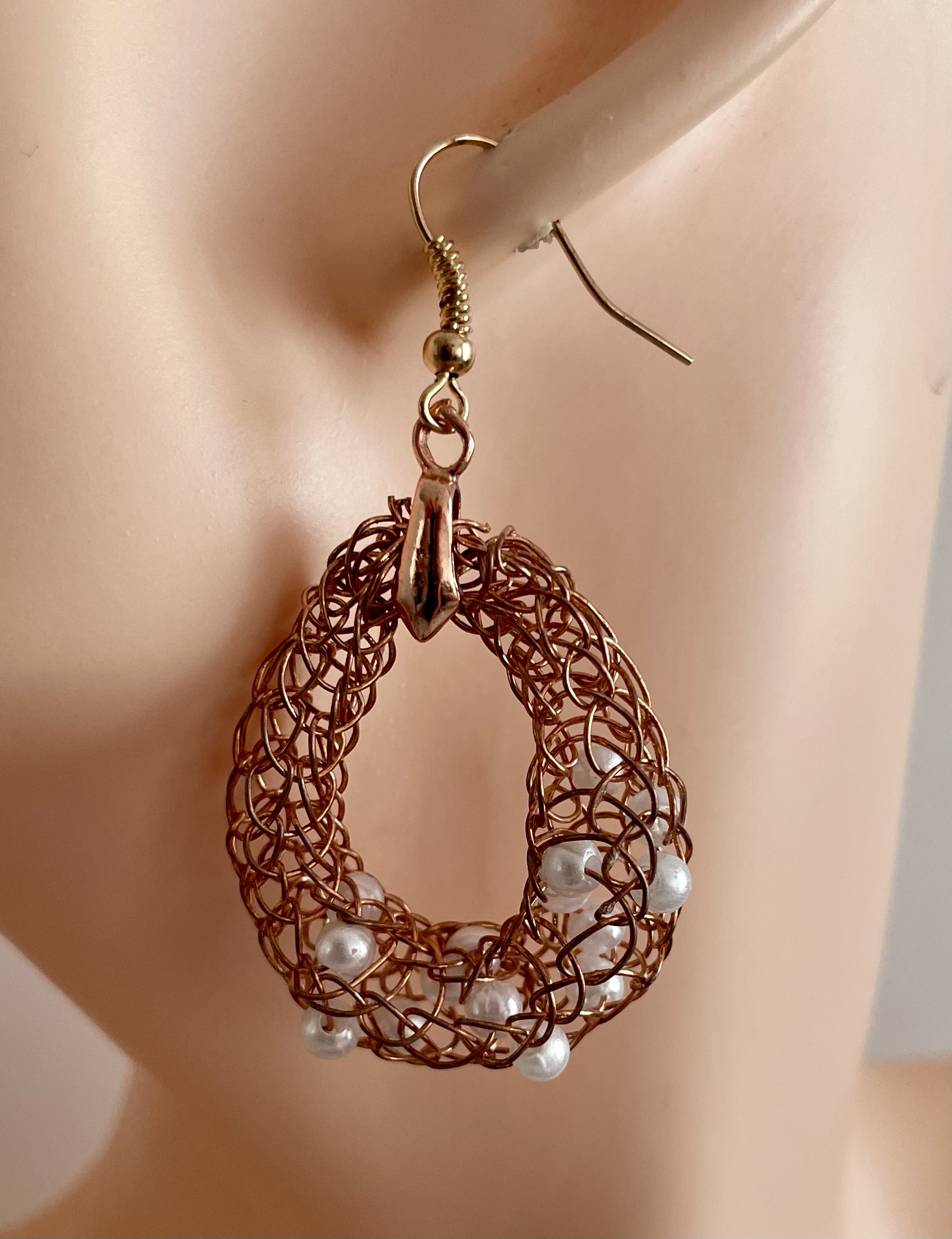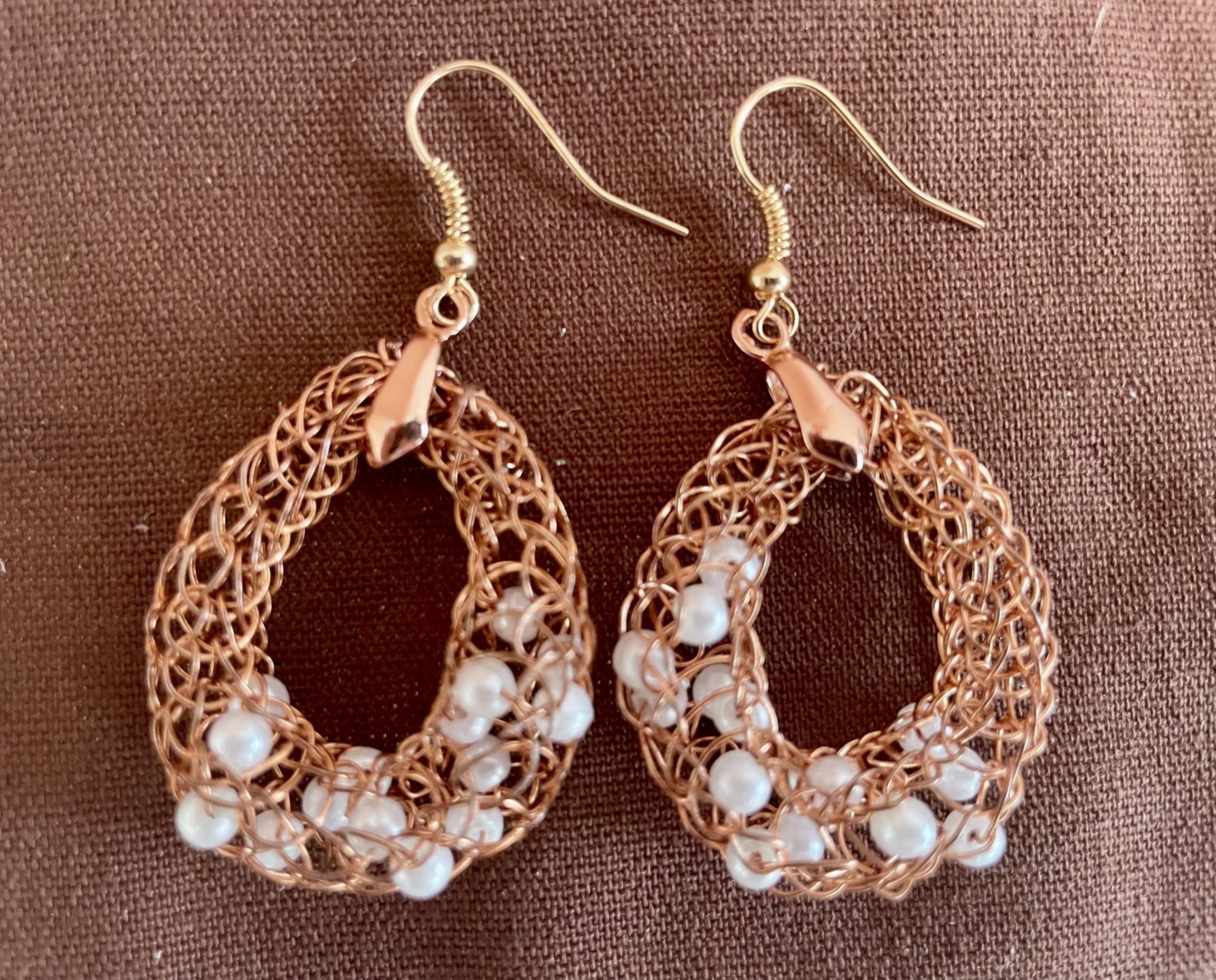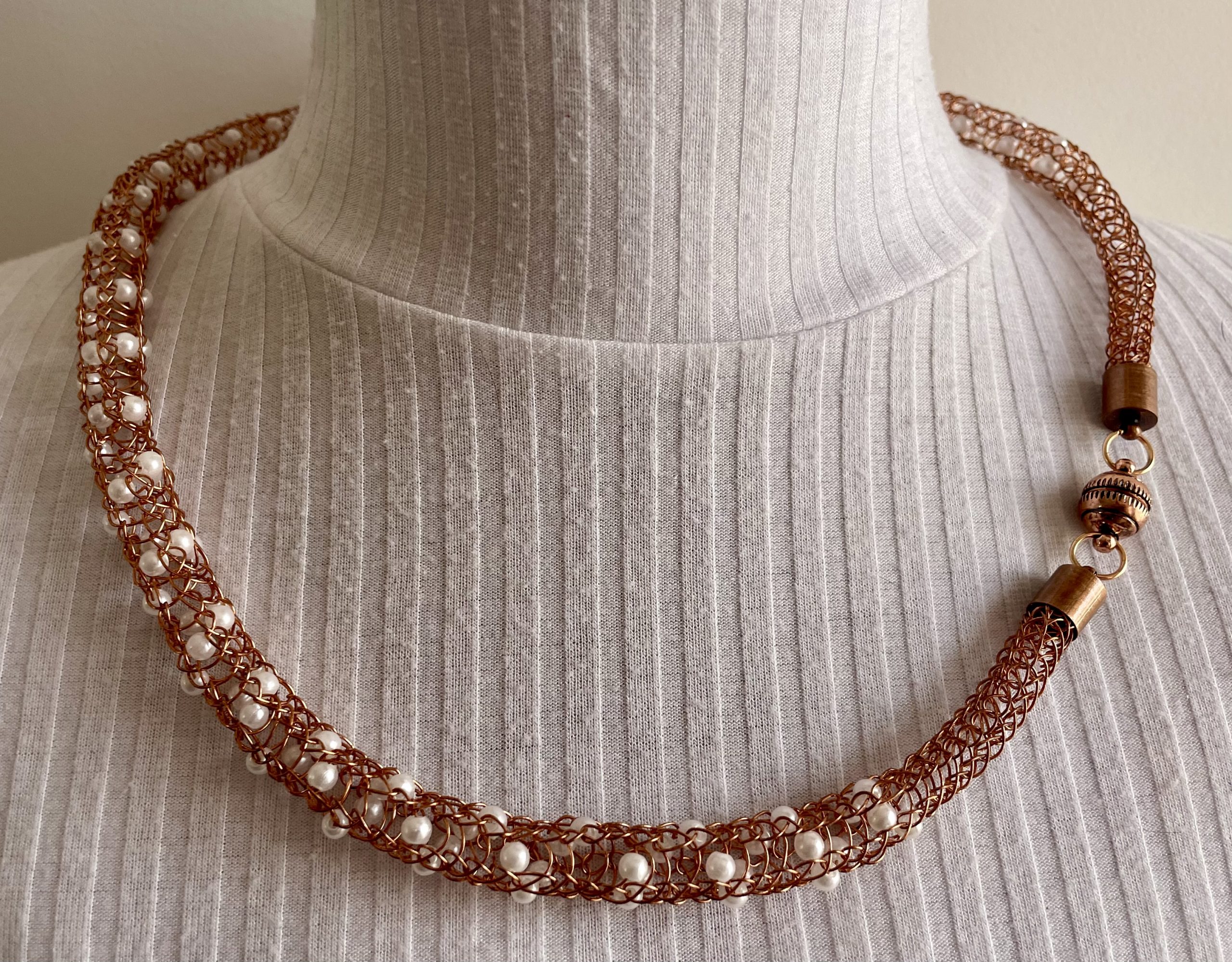 4-teiliges edles Schmuckset handgestrickt aus kupferfarbenen Schmuck-Kupferdraht, mit eingearbeiteten weißen Perlen