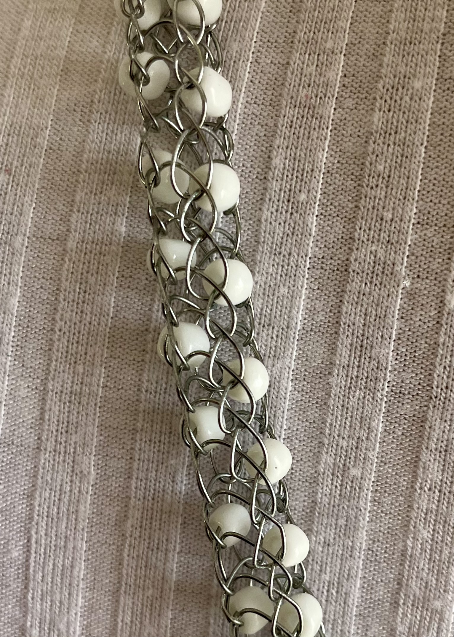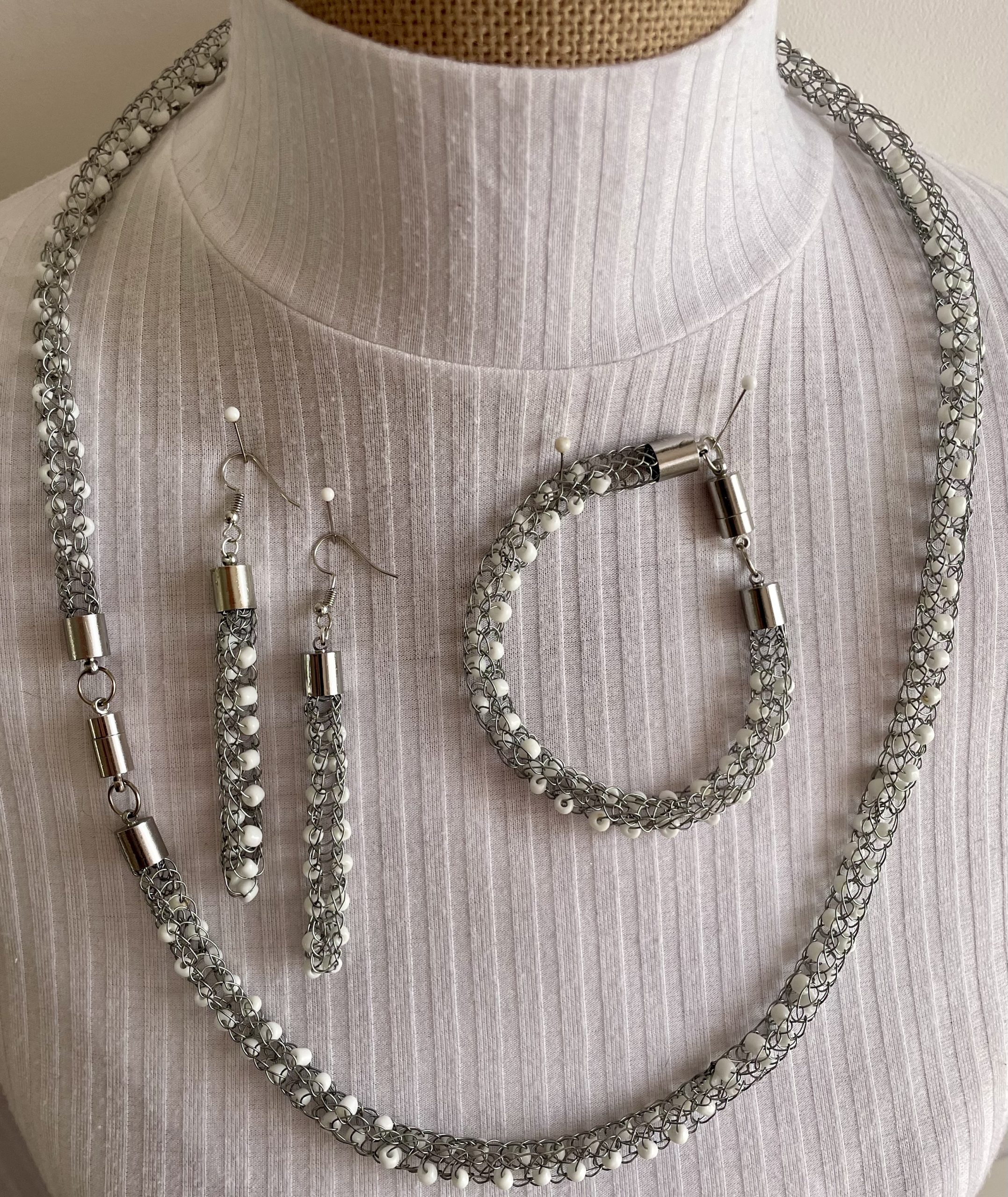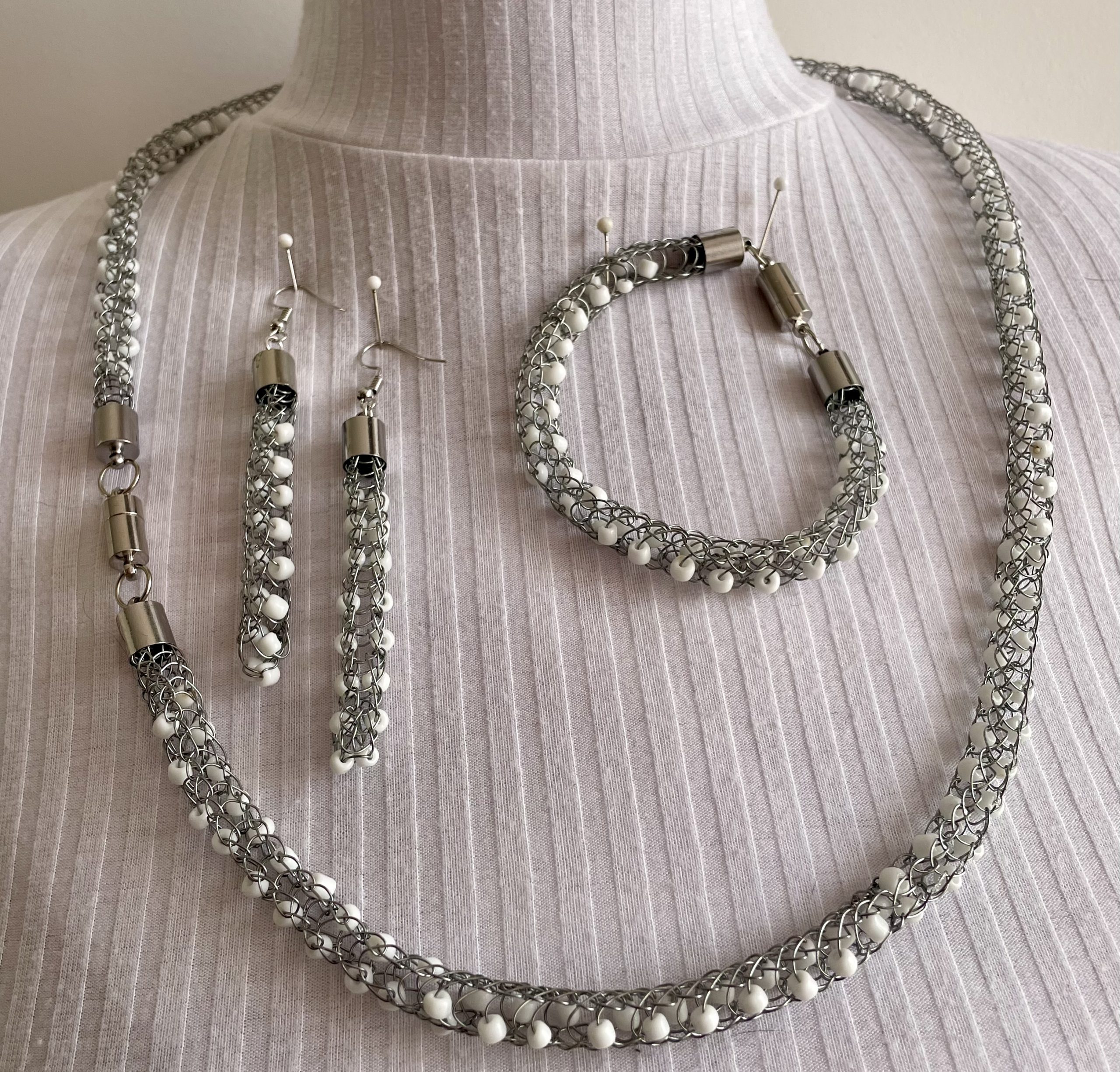 4-teiliges Schmuckset handgestrickt aus silberfarbenem Schmuck-Kupferdraht, mit eingearbeiteten weißen Glasperlen, ein Hingucker, edel, filigran.