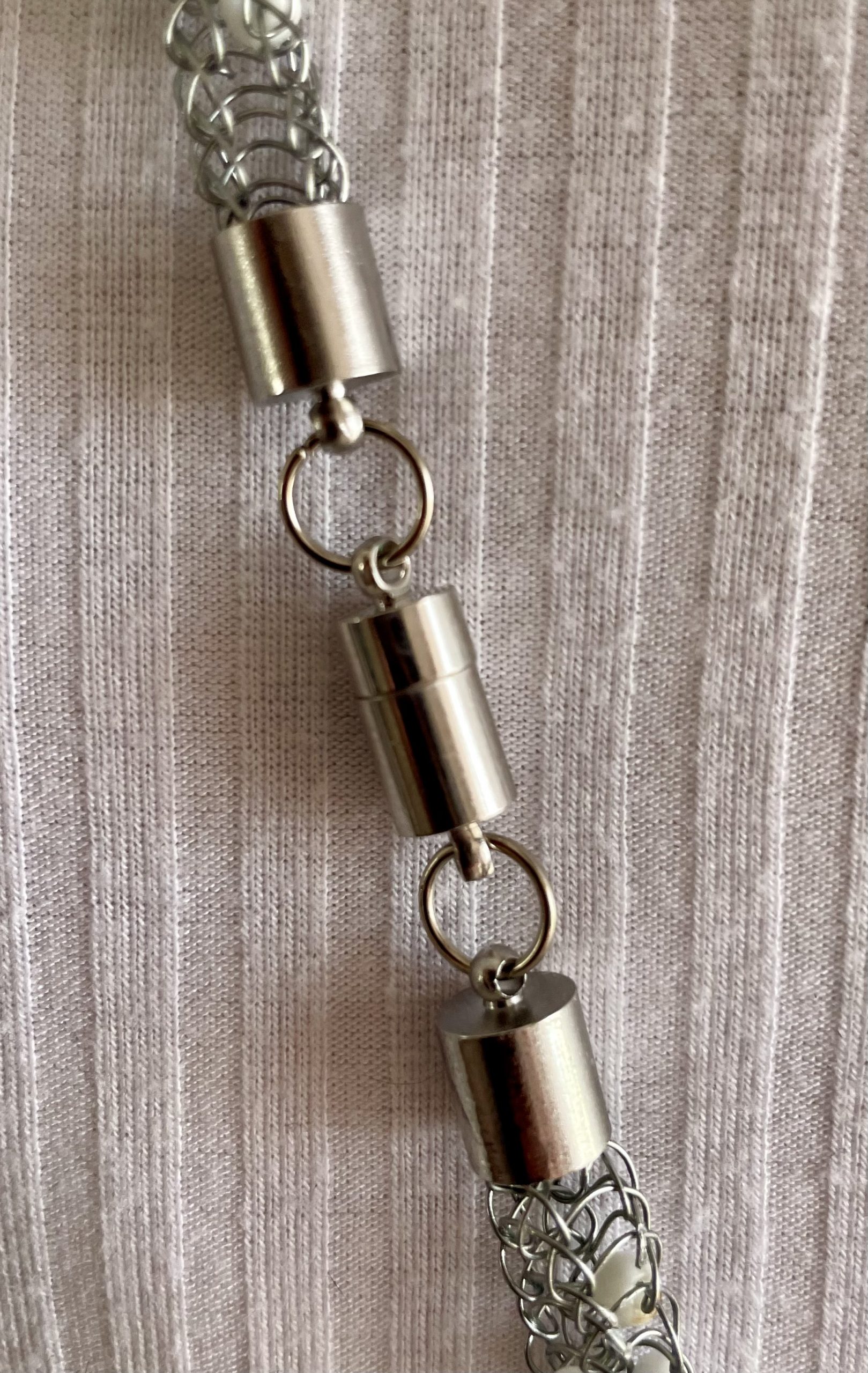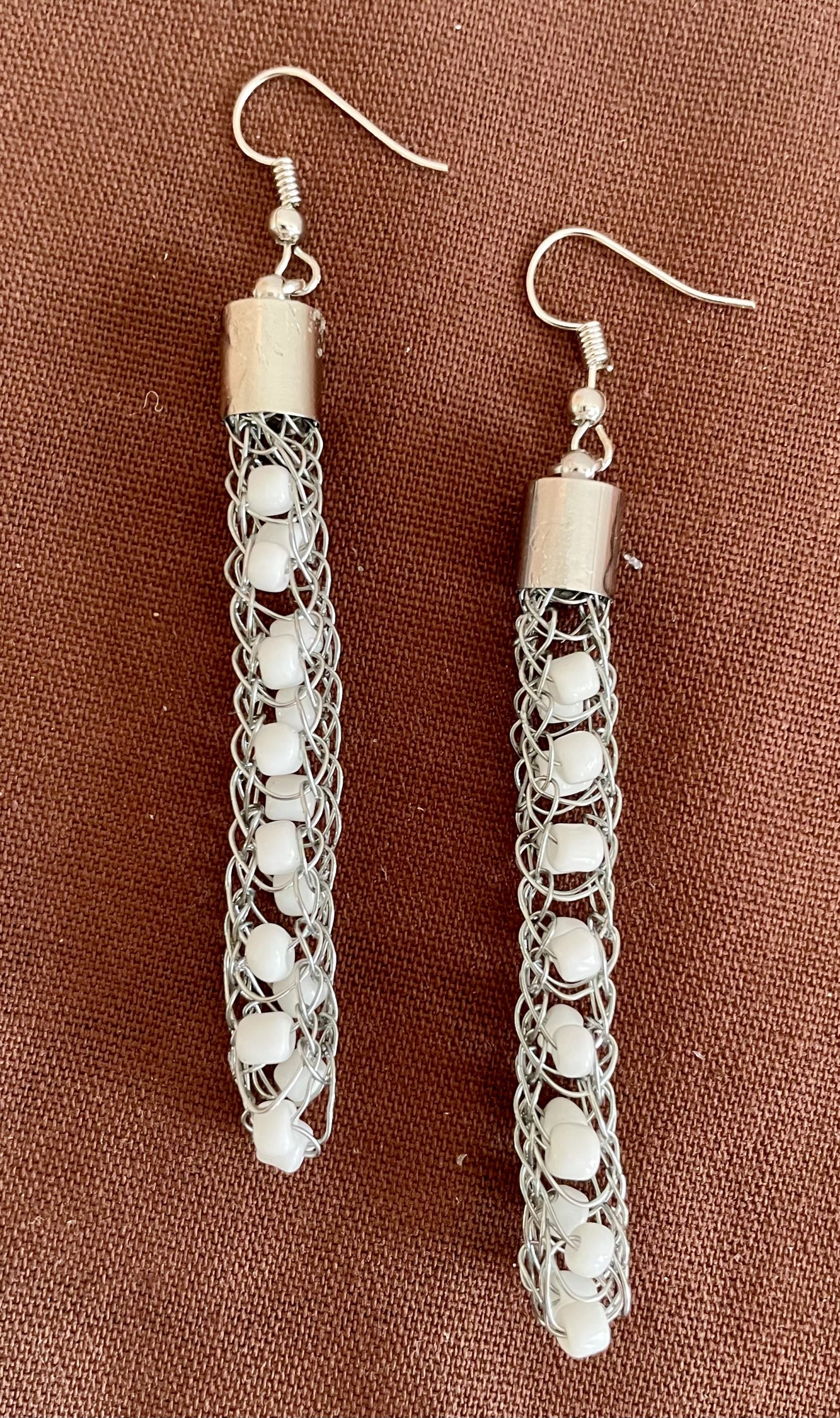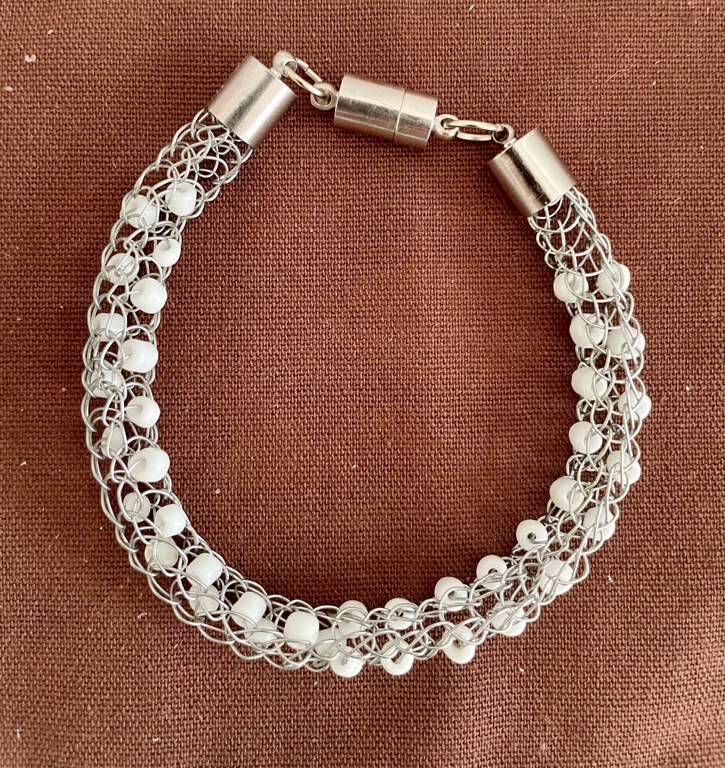 4-teiliges Schmuckset handgestrickt aus silberfarbenem Schmuck-Kupferdraht, mit eingearbeiteten weißen Glasperlen, ein Hingucker, edel, filigran.