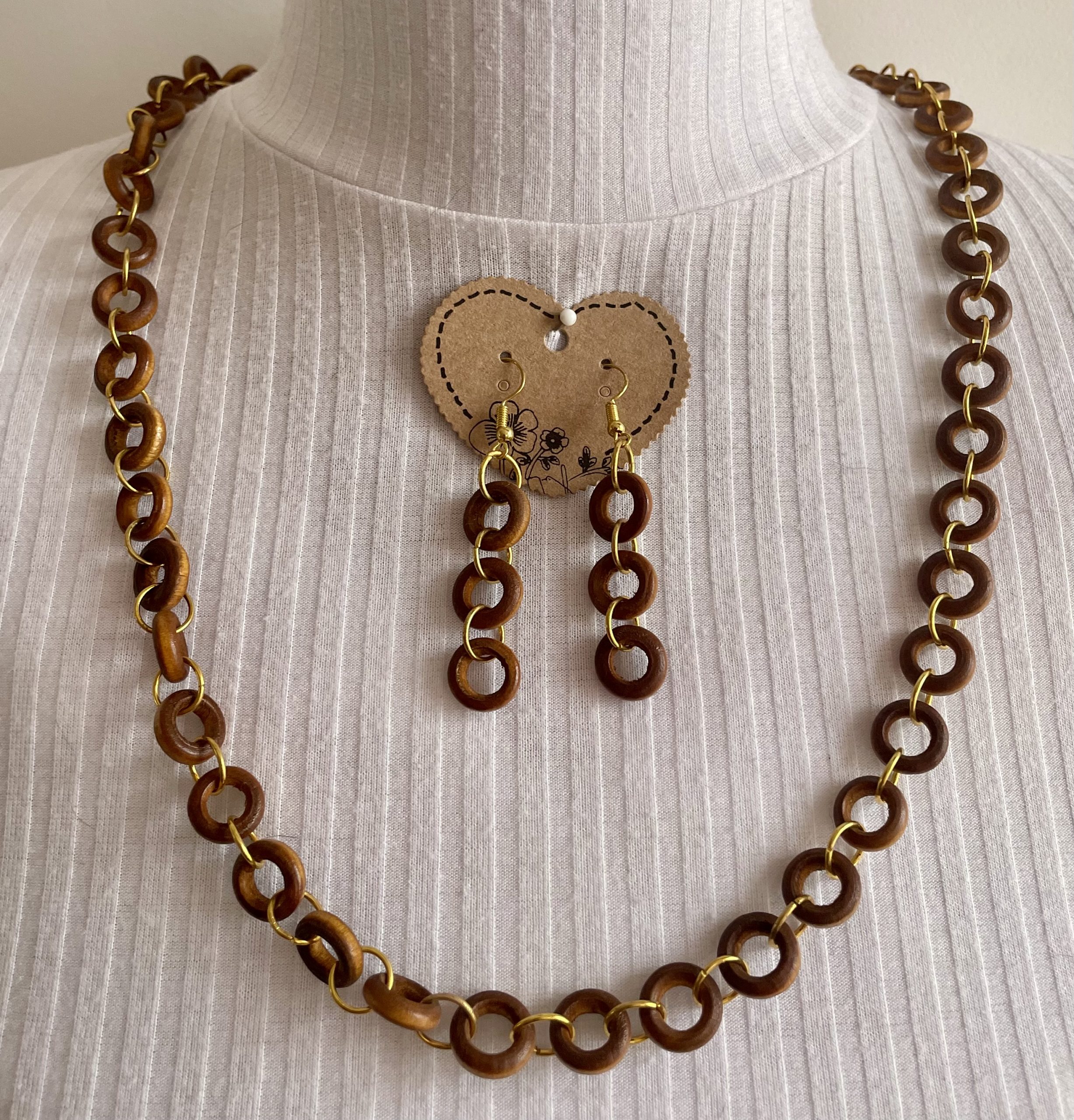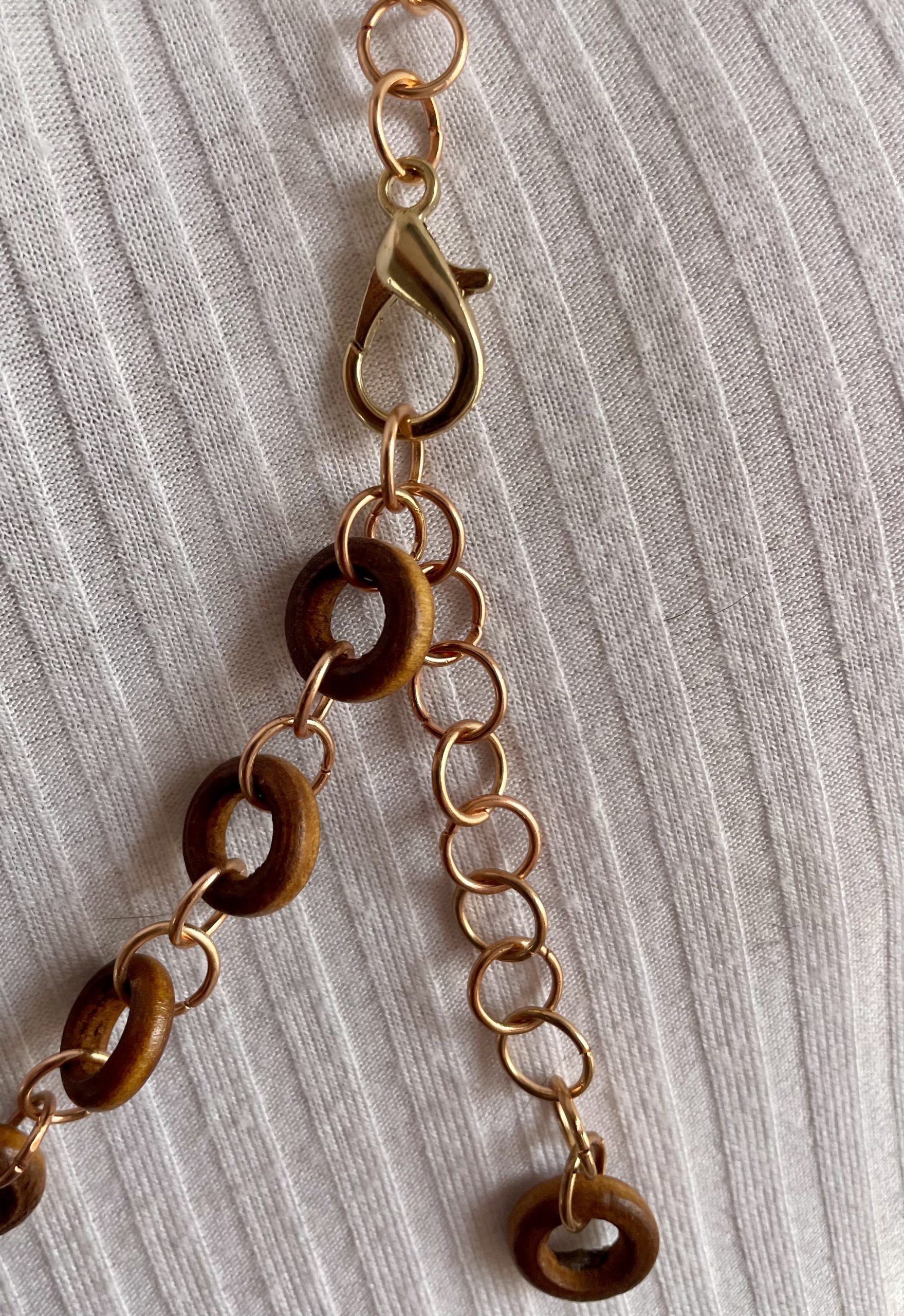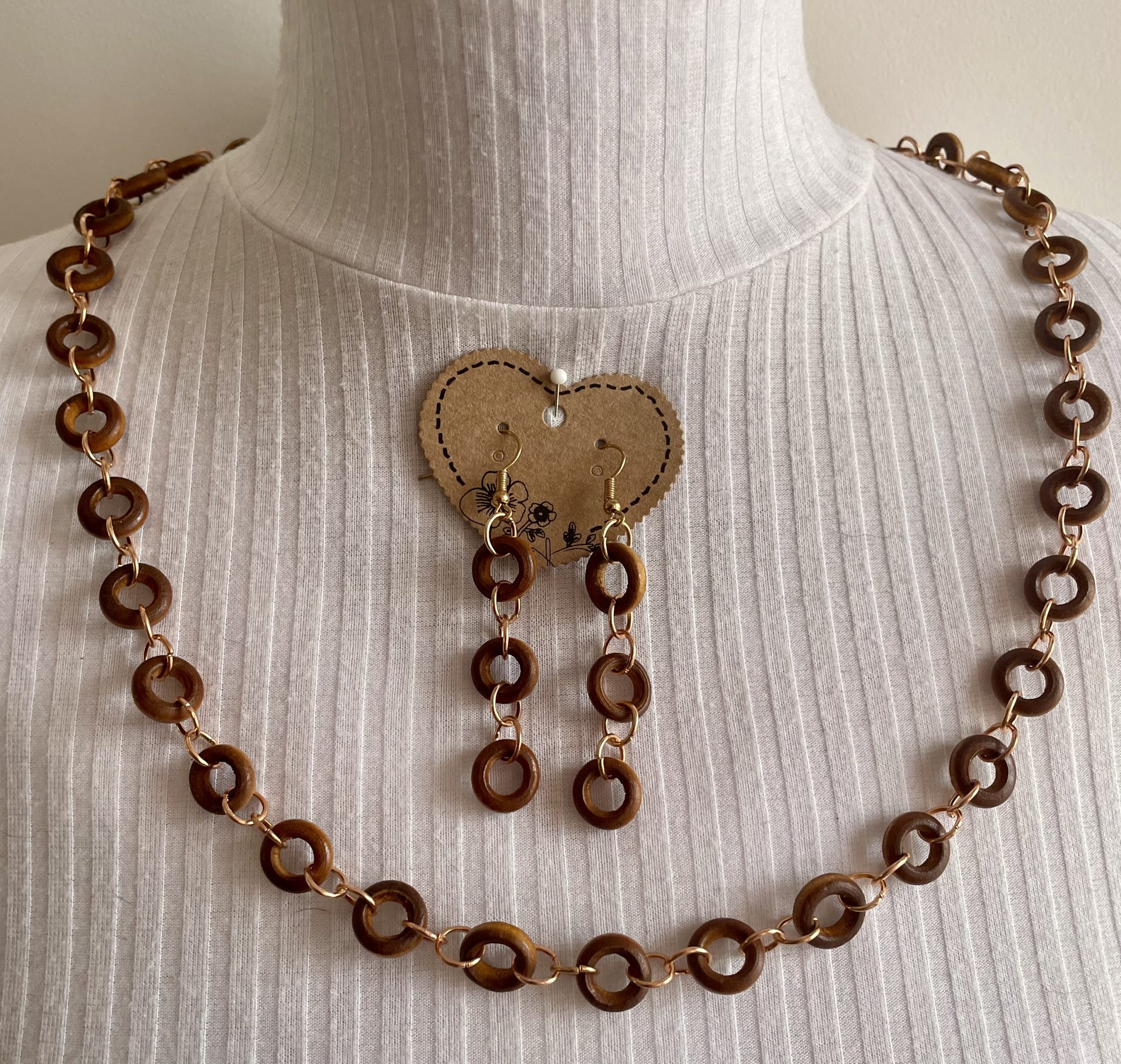 3-teiliges Schmuckset aus Holzperlen / Holzringen mit roségoldfarbenen Ringen hergestellt, eine sehr leichte aber auch edle Halskette