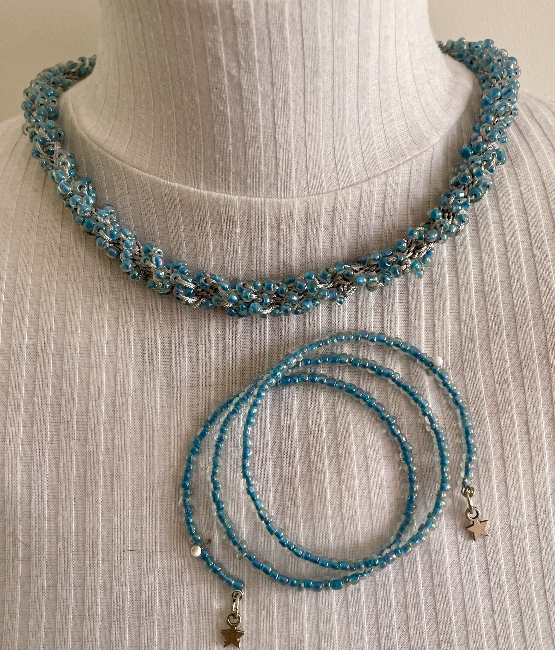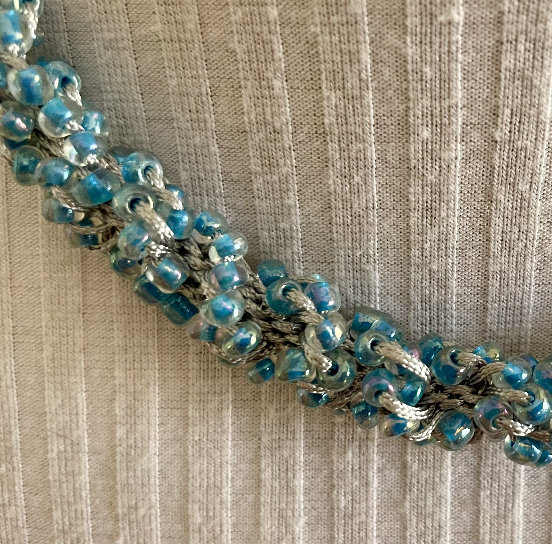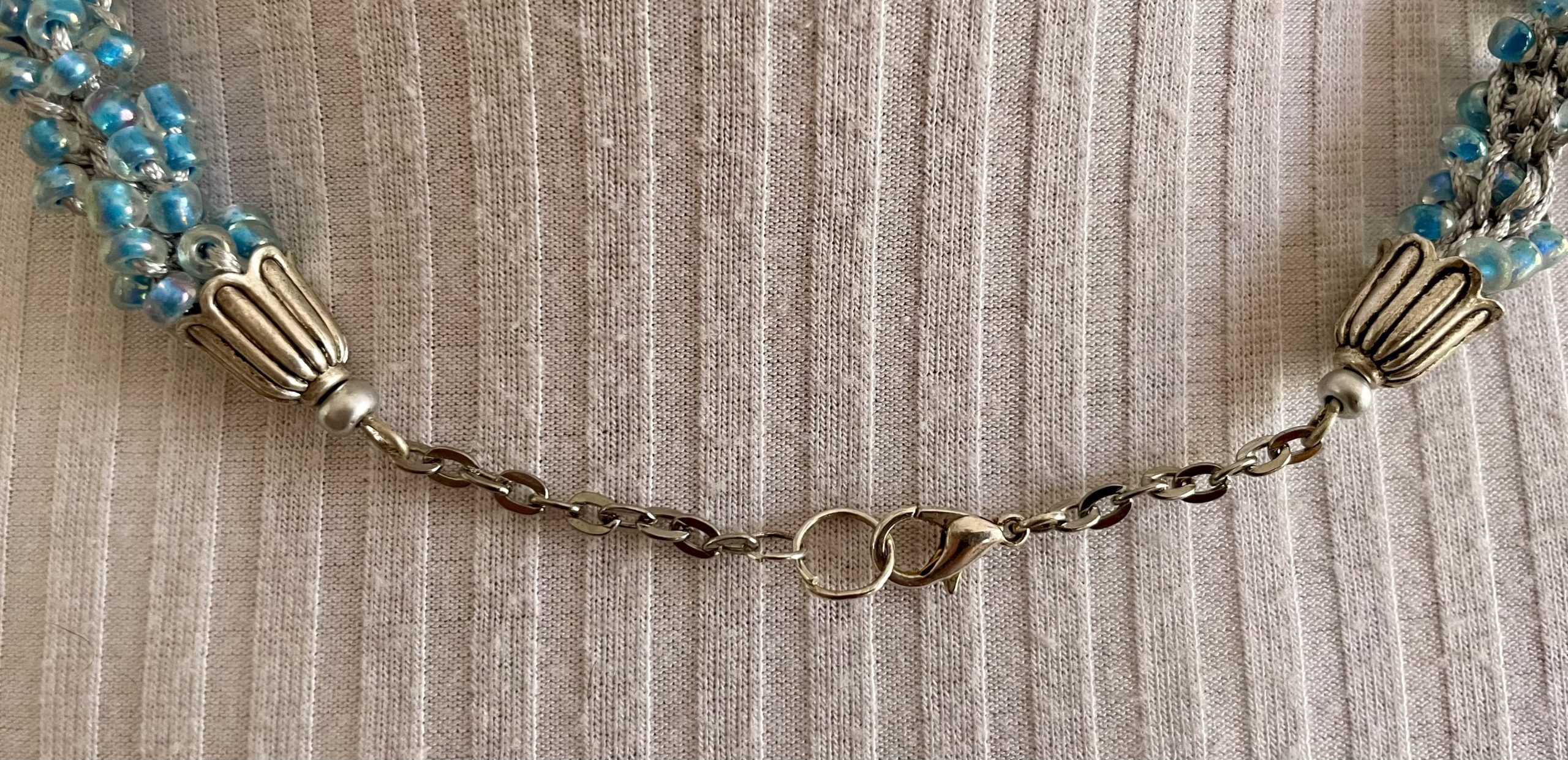 Geflochtene silberfarbene Halskette mit eingearbeiteten farblich passenden hellblauen Glasperlen. Länge der Kette ist ca 50 cm, geschlossen wird sie mit einem farblich passenden Karabinerhaken. Kette hat einen Durchmesser von ca. 0,8 cm.