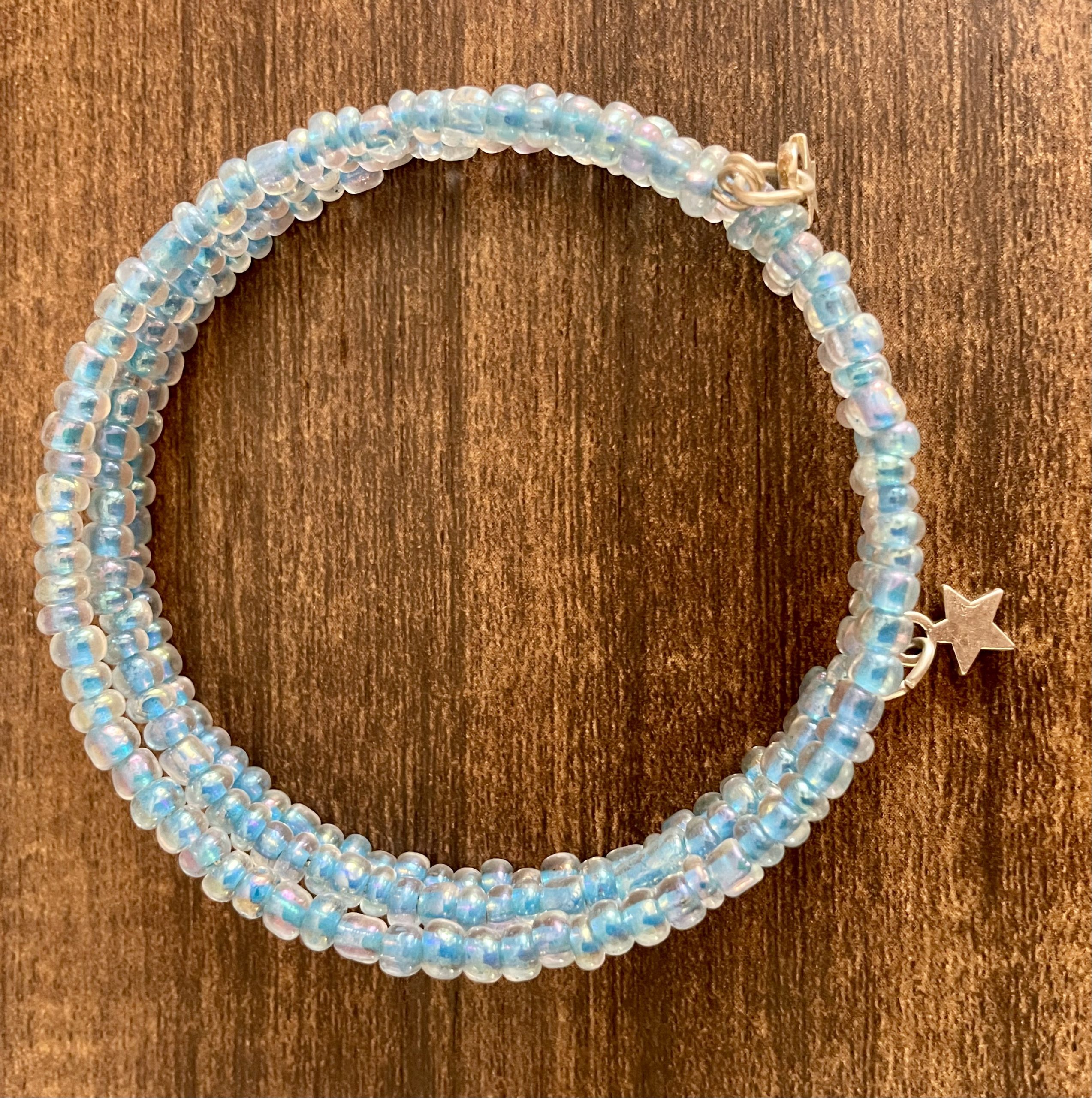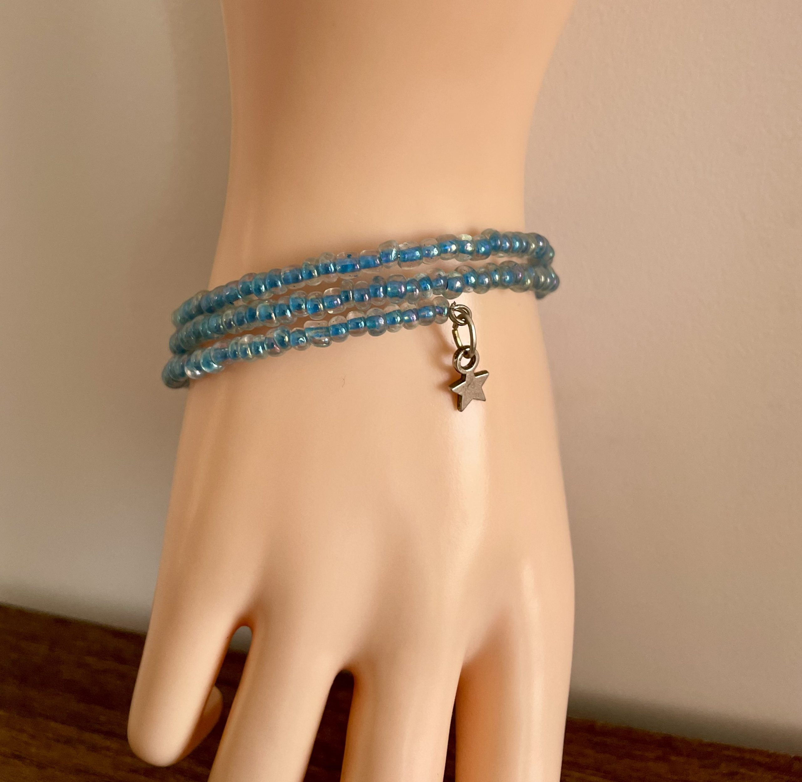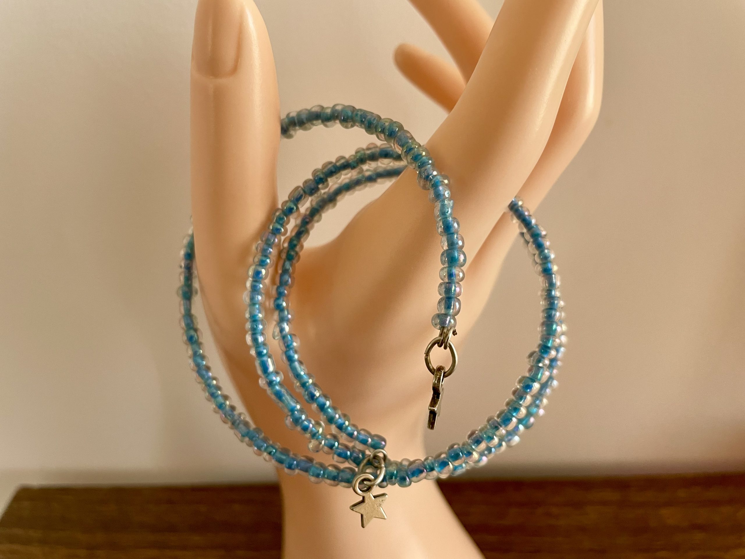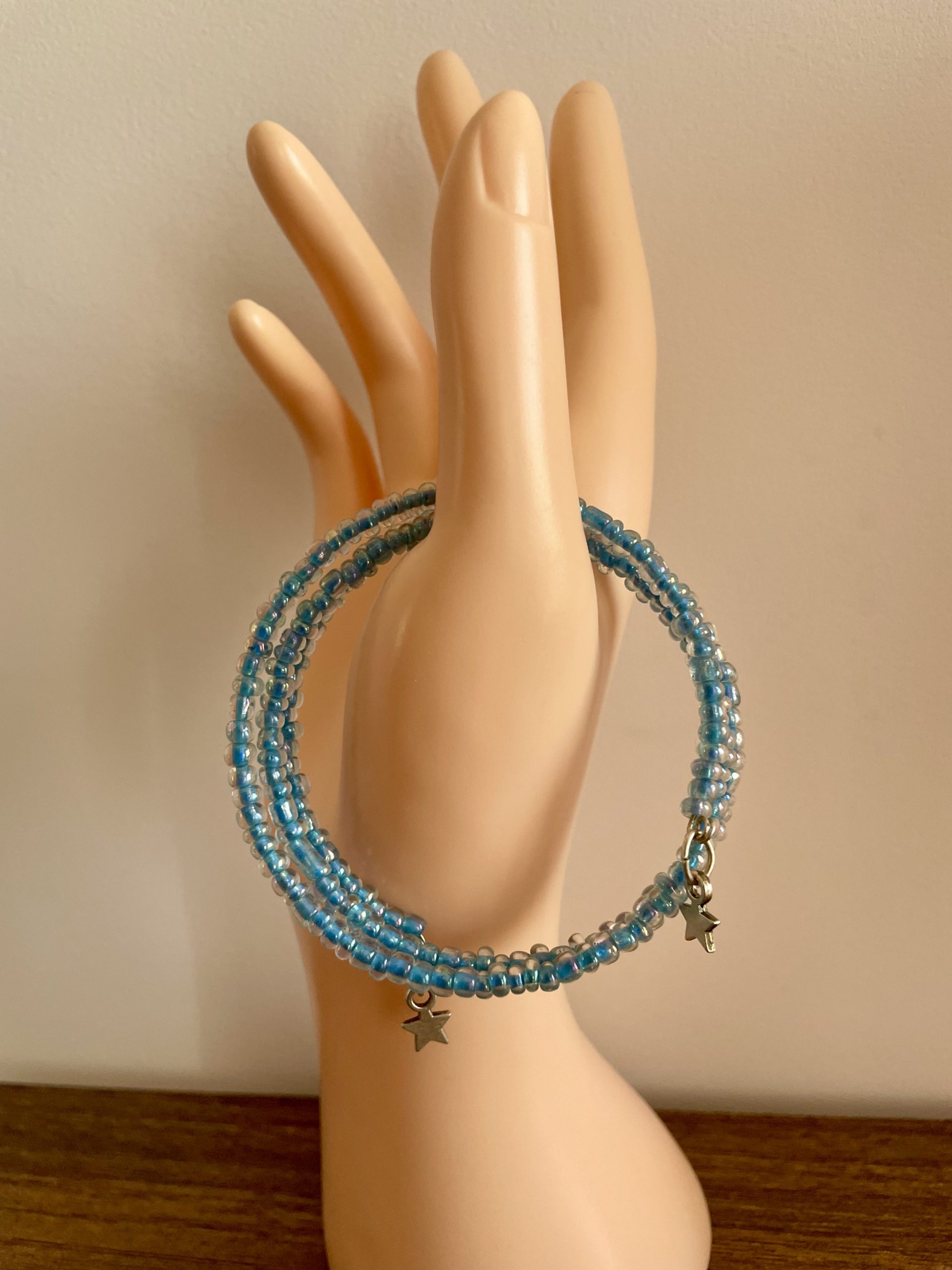 Armband ist flexibel, einfach über das Handgelenk anzulegen, mit einer Gesamtlänge von ca 55 cm, an beiden Enden mit jeweils einem kleinen silberfarbenen Stern verziert.