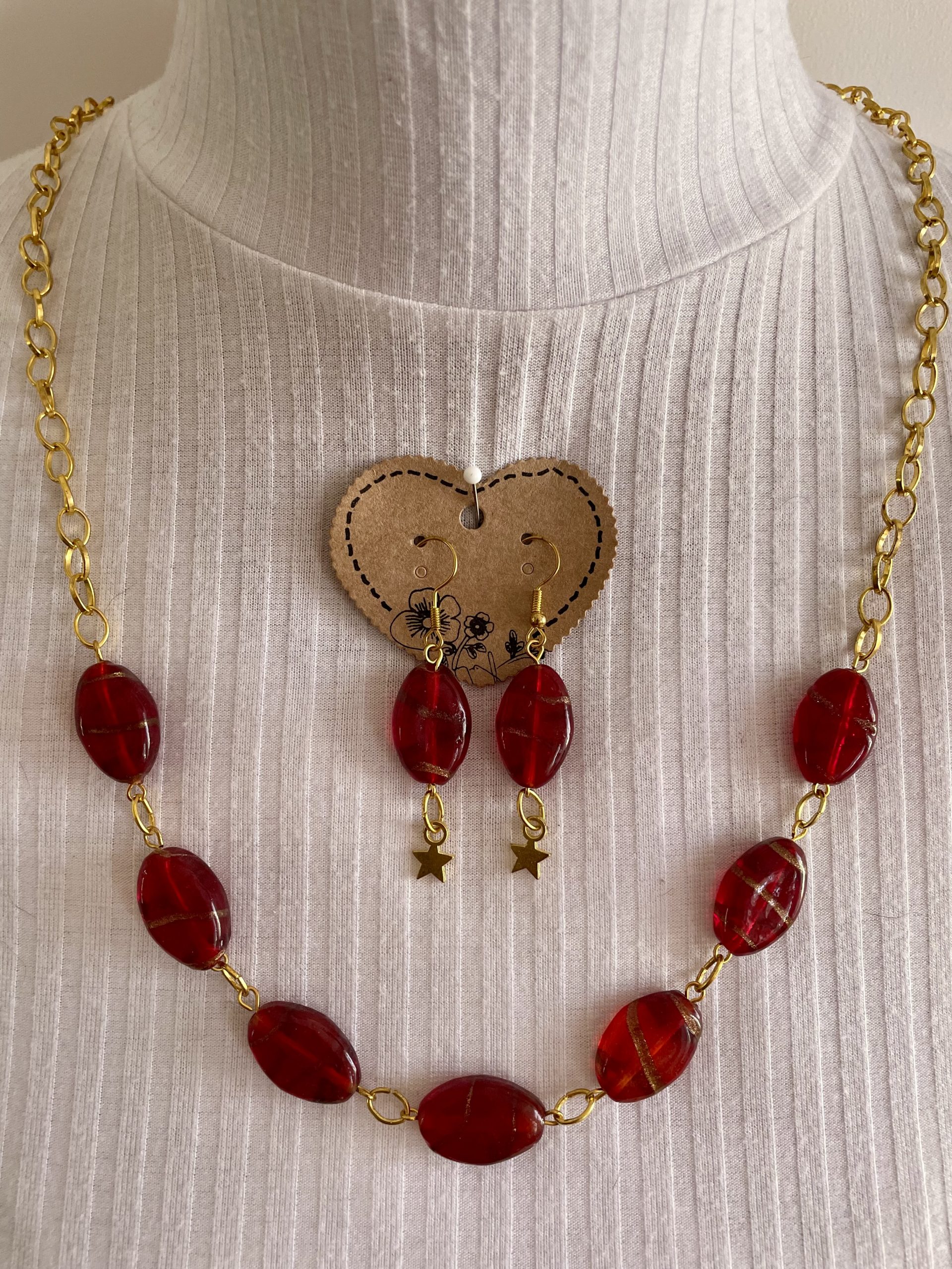 Eine elegante goldfarbene Halskette mit 7 eingearbeiteten roten Perlen. Dazu gibt es passende Ohrringe.