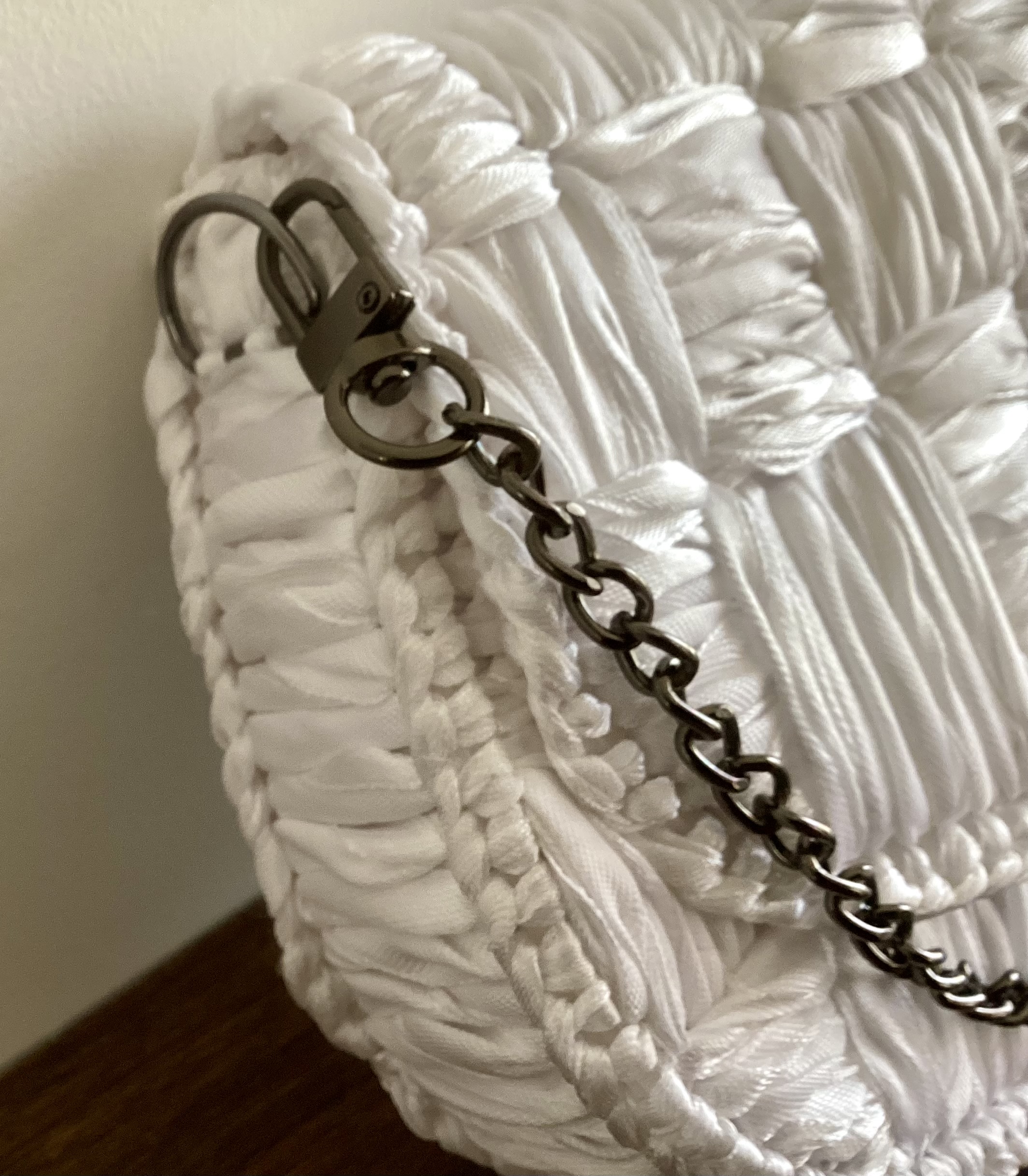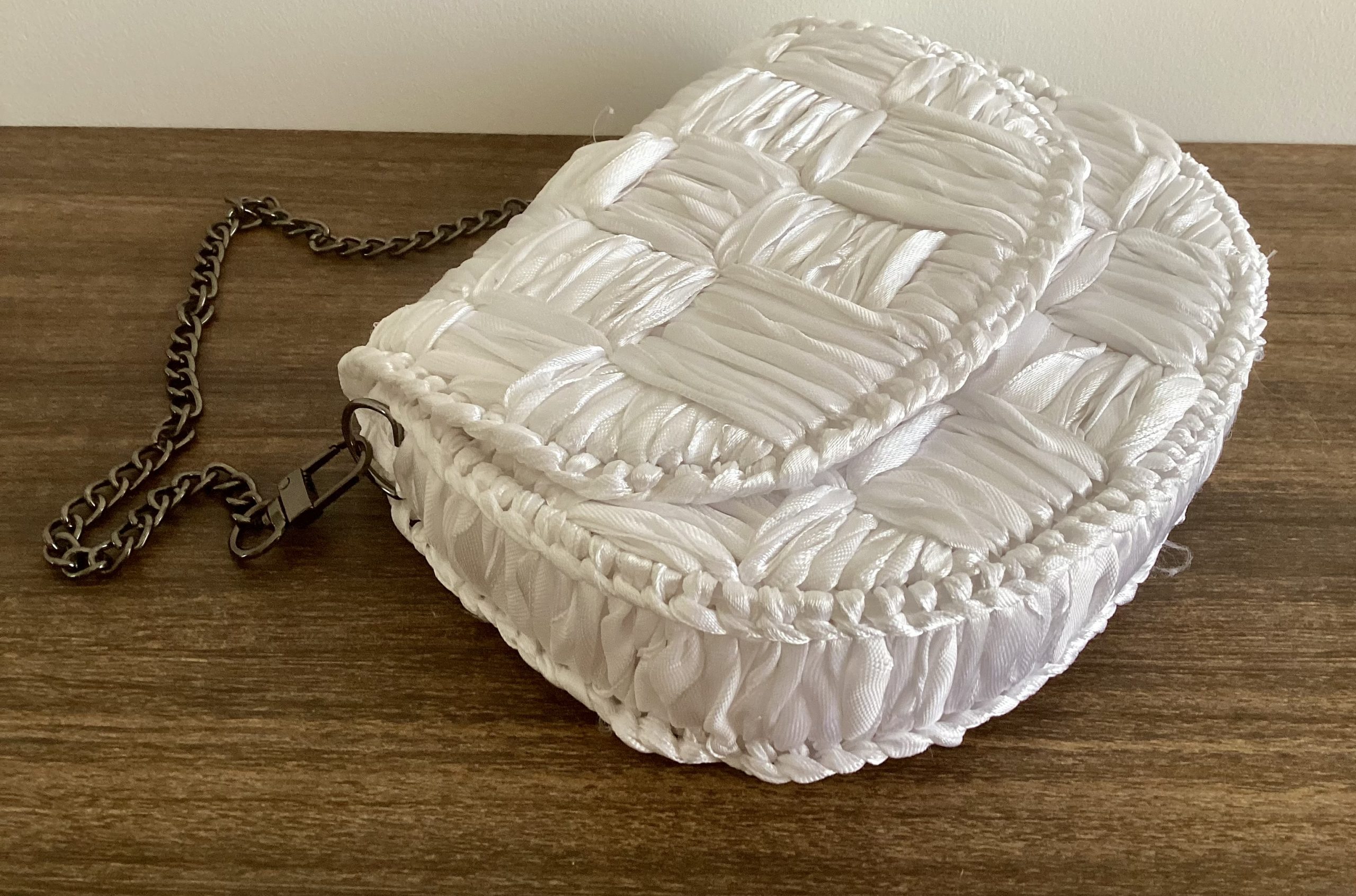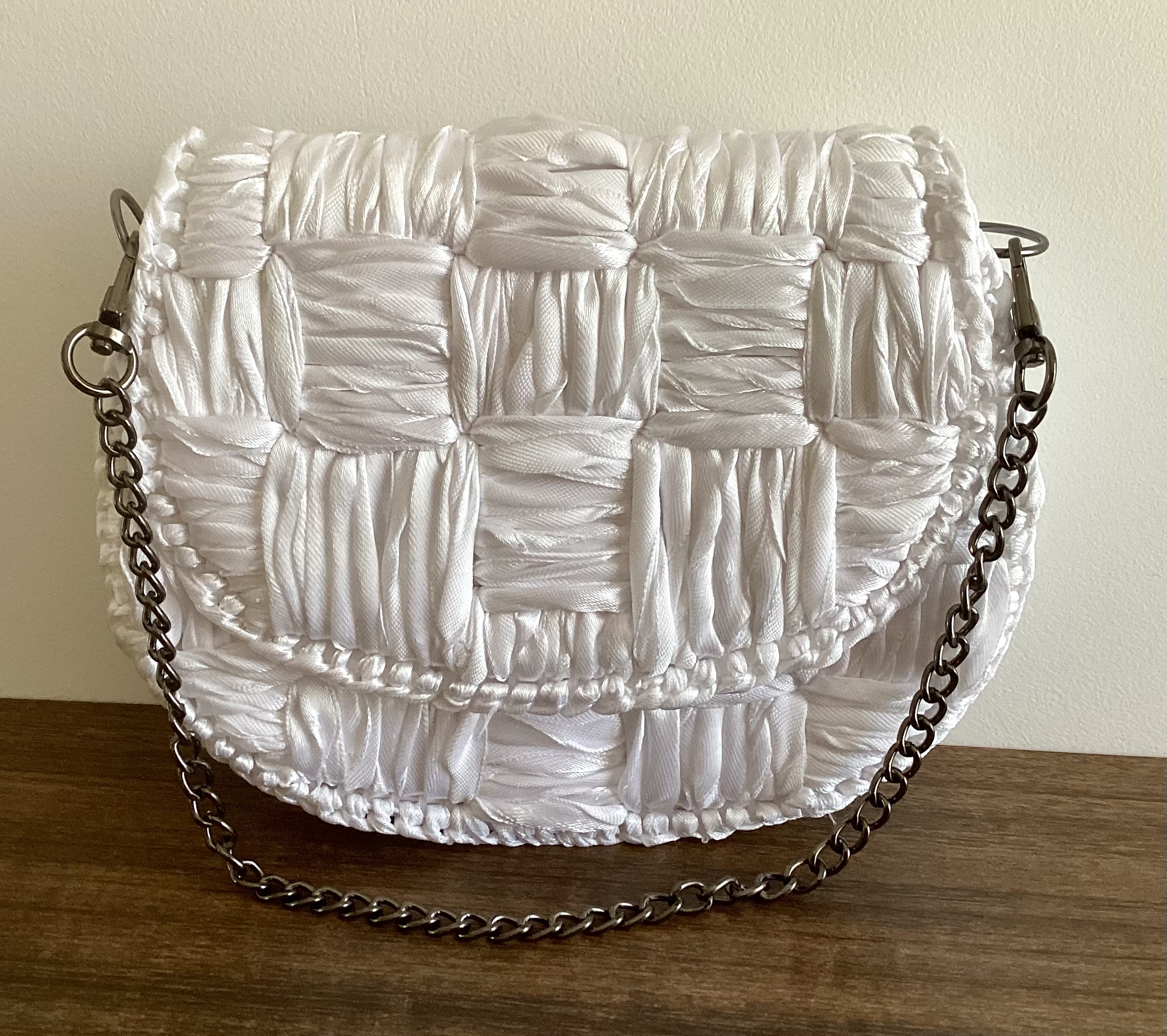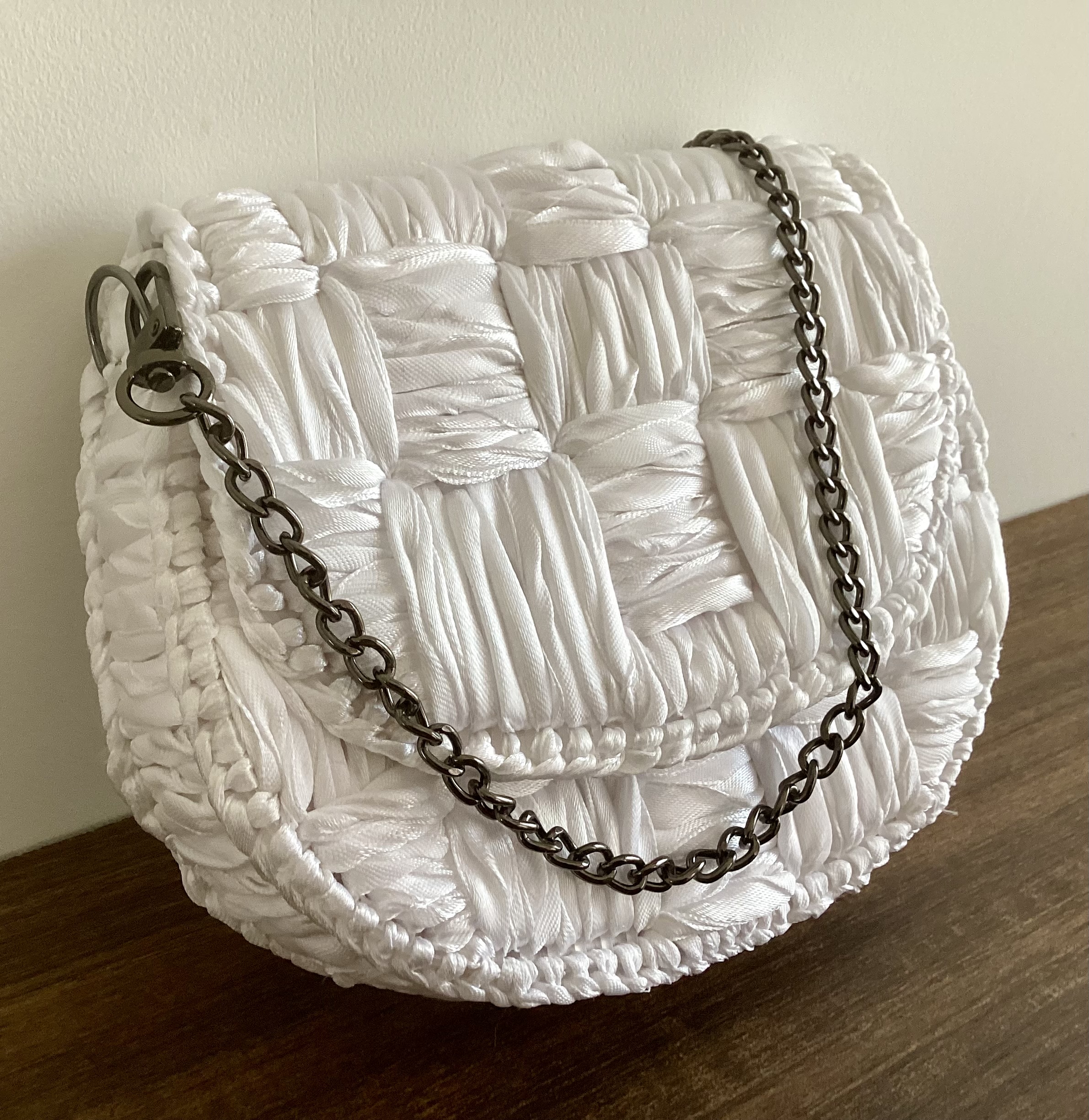 Diese Tasche ist solide und robust, verfügt über eine abnehmbare ca 40 cm lange dunkel graue Kette zum umhängen, in Handarbeit gestickt.